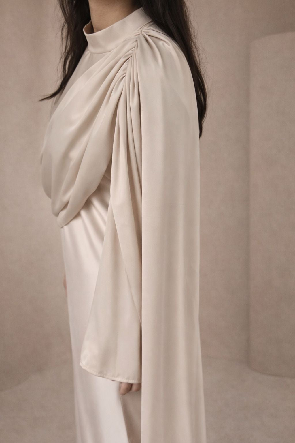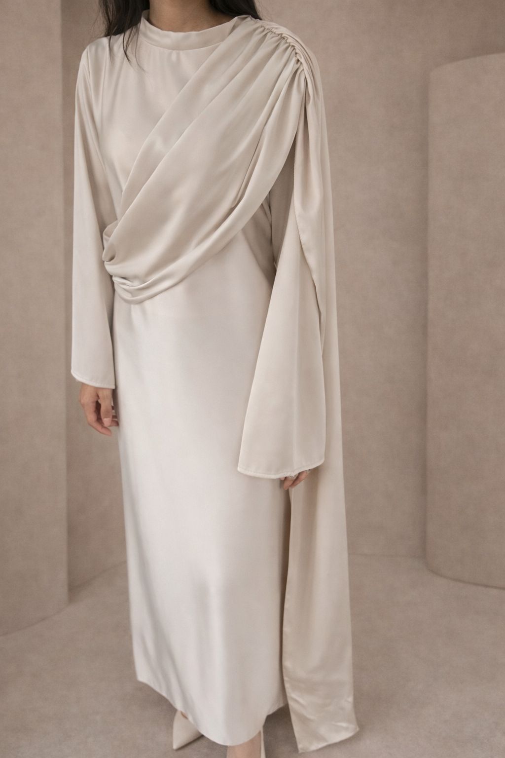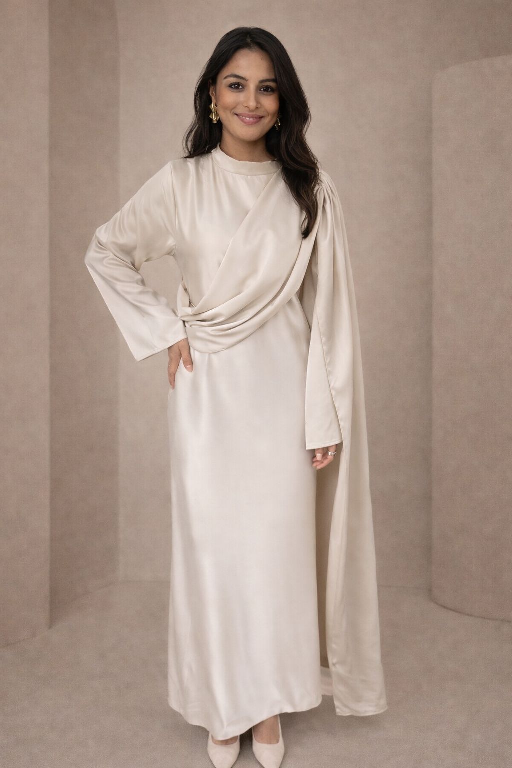 Lange beige satijn jurk met een mooie pasvorm. De jurk heeft lange mouwen en een ronde hals. De jurk heeft een koord aan de taille om het aan te spannen en een elegante gedrapeerde stuk aan de voorzijde. De jurk is een onesize en kan gedragen worden van een S tot een L.