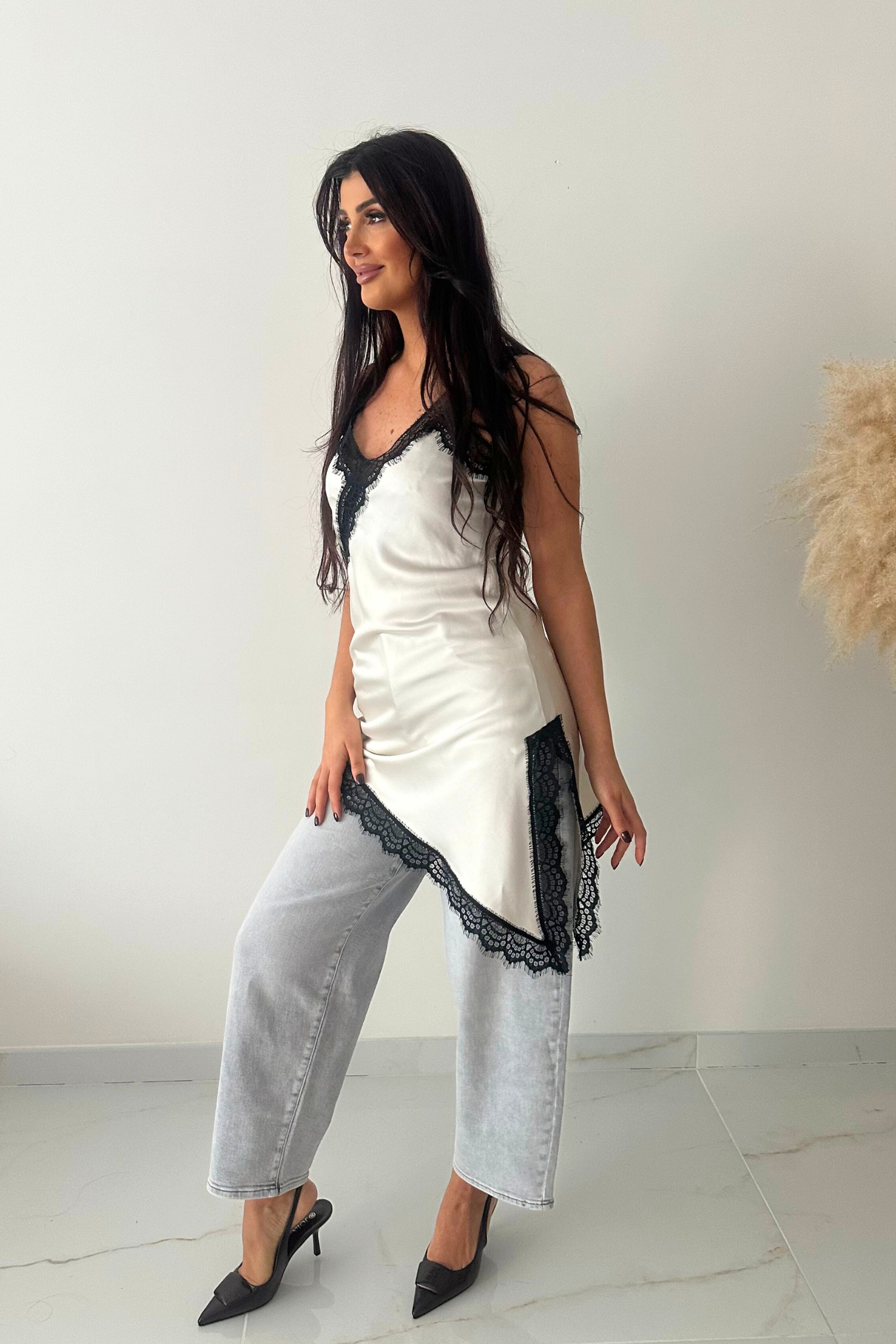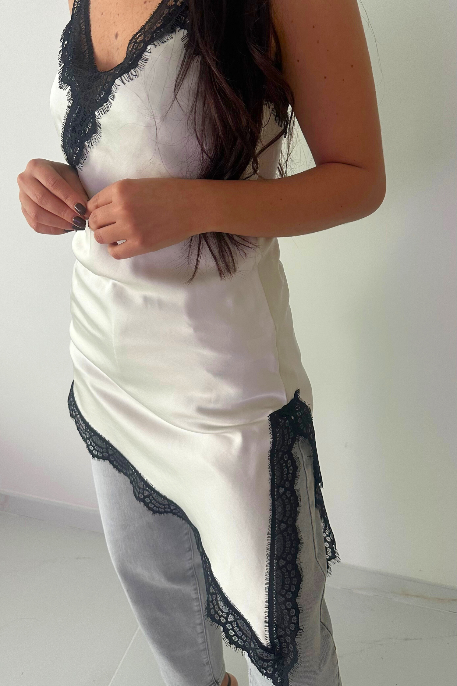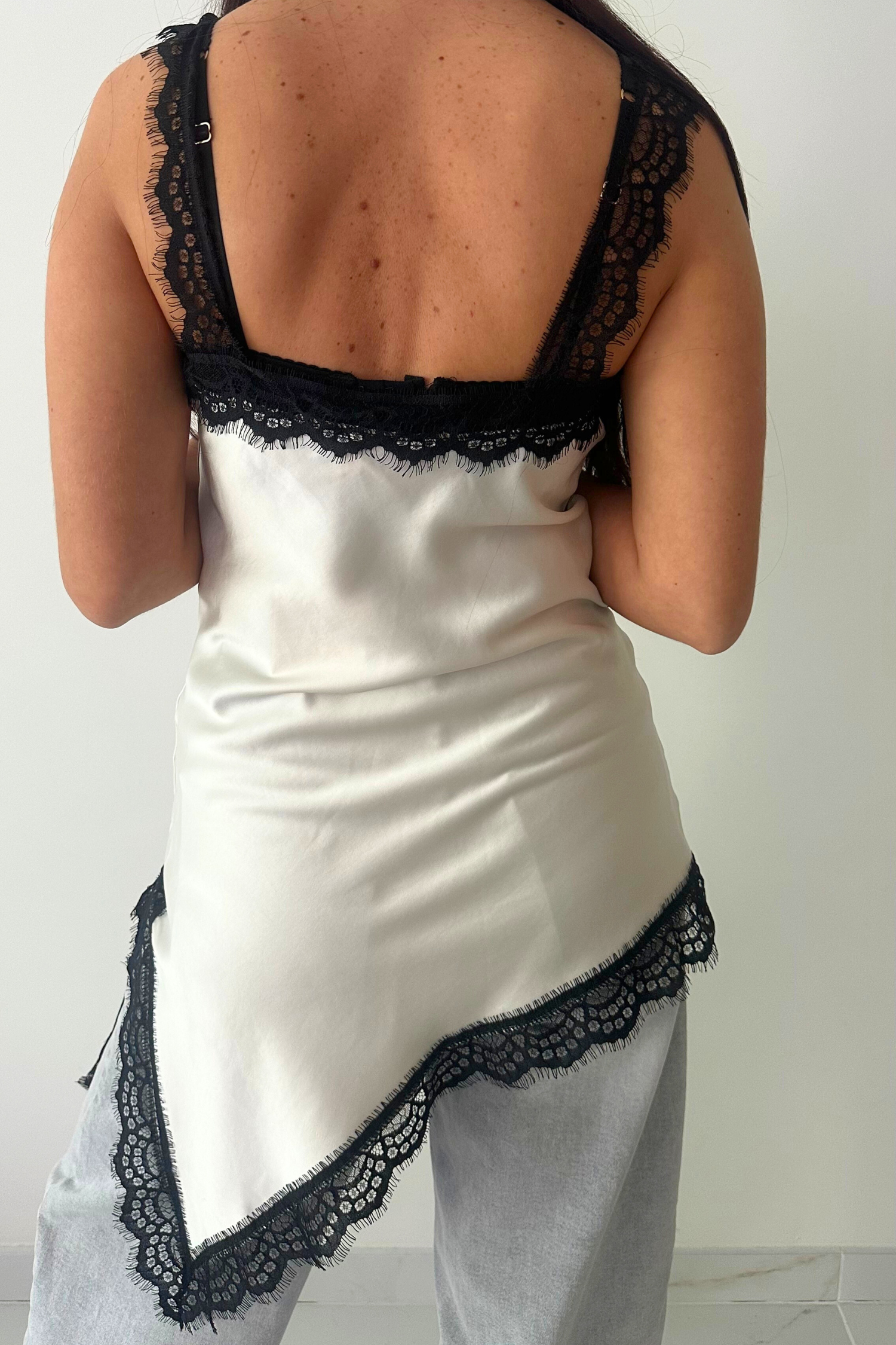 Deze satijnen ecru top combineert luxe en drama in één elegant ontwerp. Het zwarte kanten detail voegt een verfijnde, vrouwelijke touch toe, terwijl de assymetrische snit zorgt voor een gedurfd en modern silhout. Combineer op een wide leg jeans en een blazer voor een trendy casual outfit.