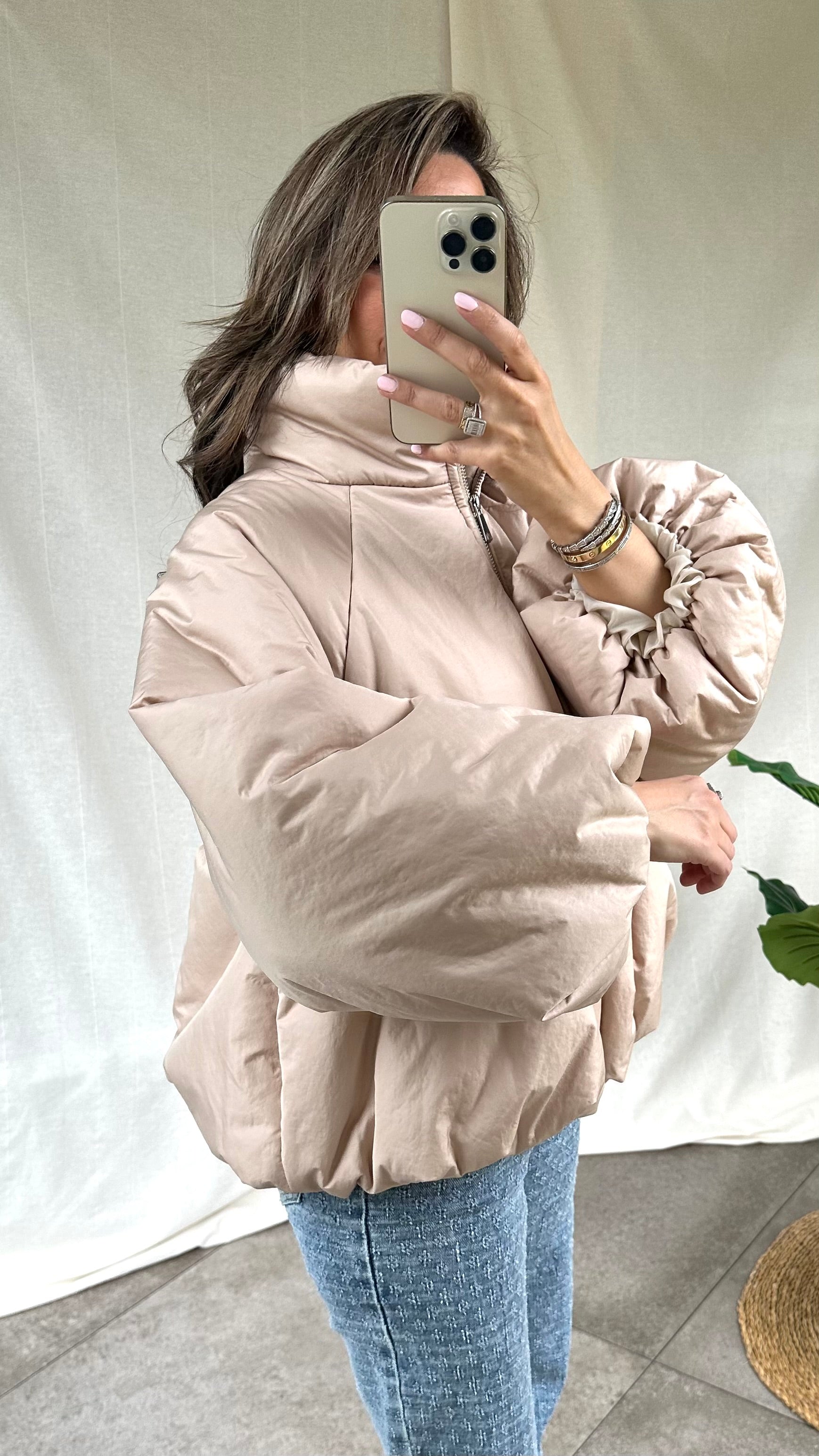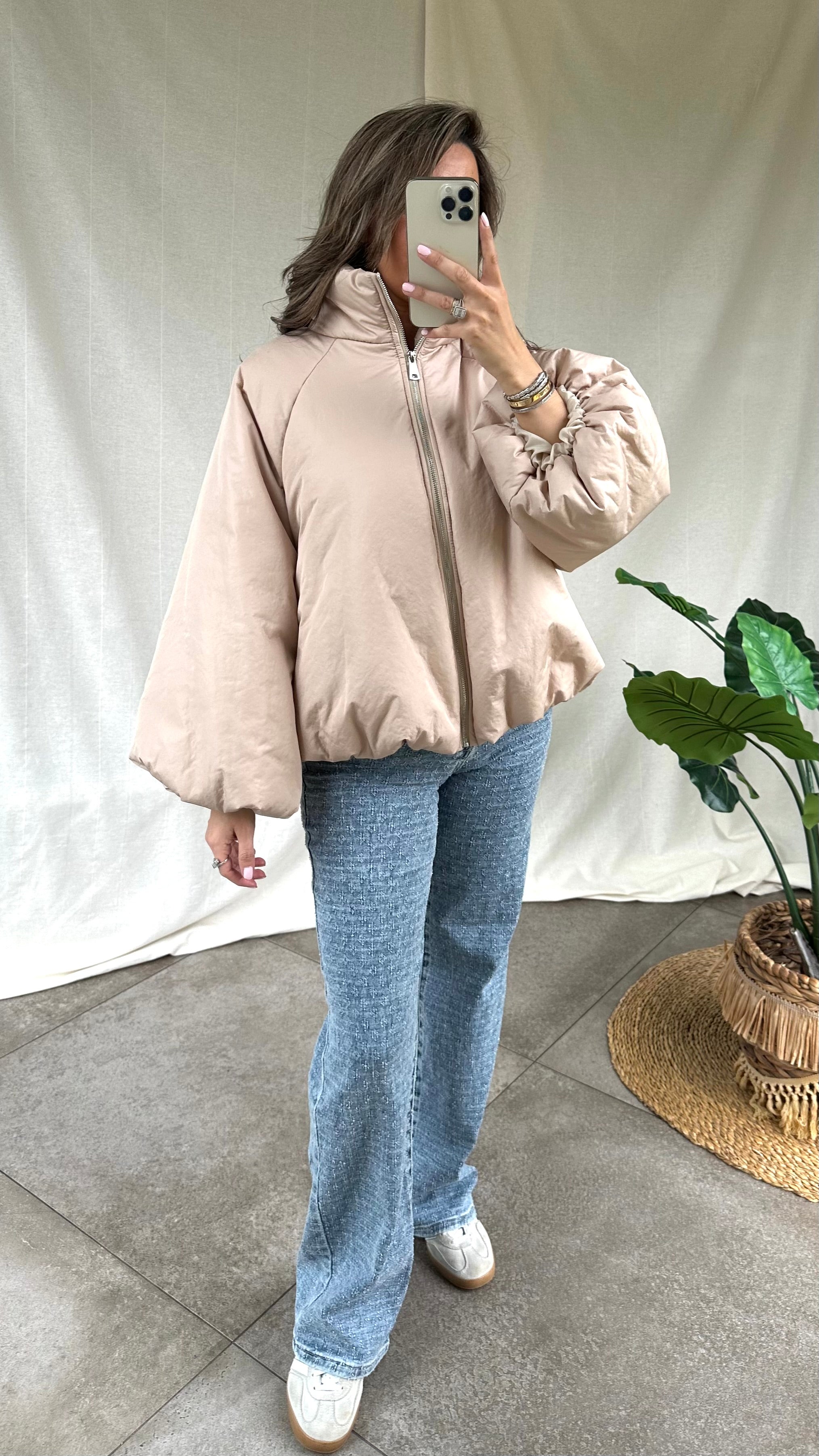Gedetailleerd met elastiek aan de onderkant waardoor het jasje gepoft valt.