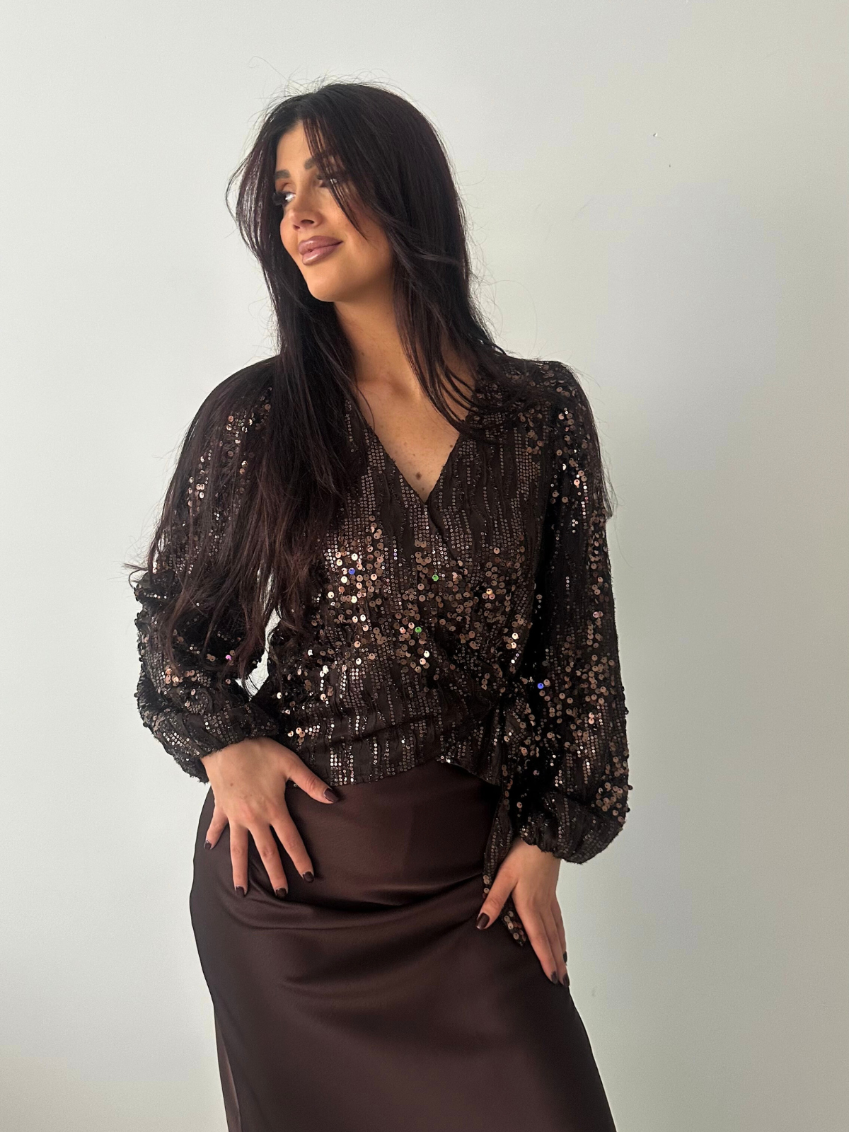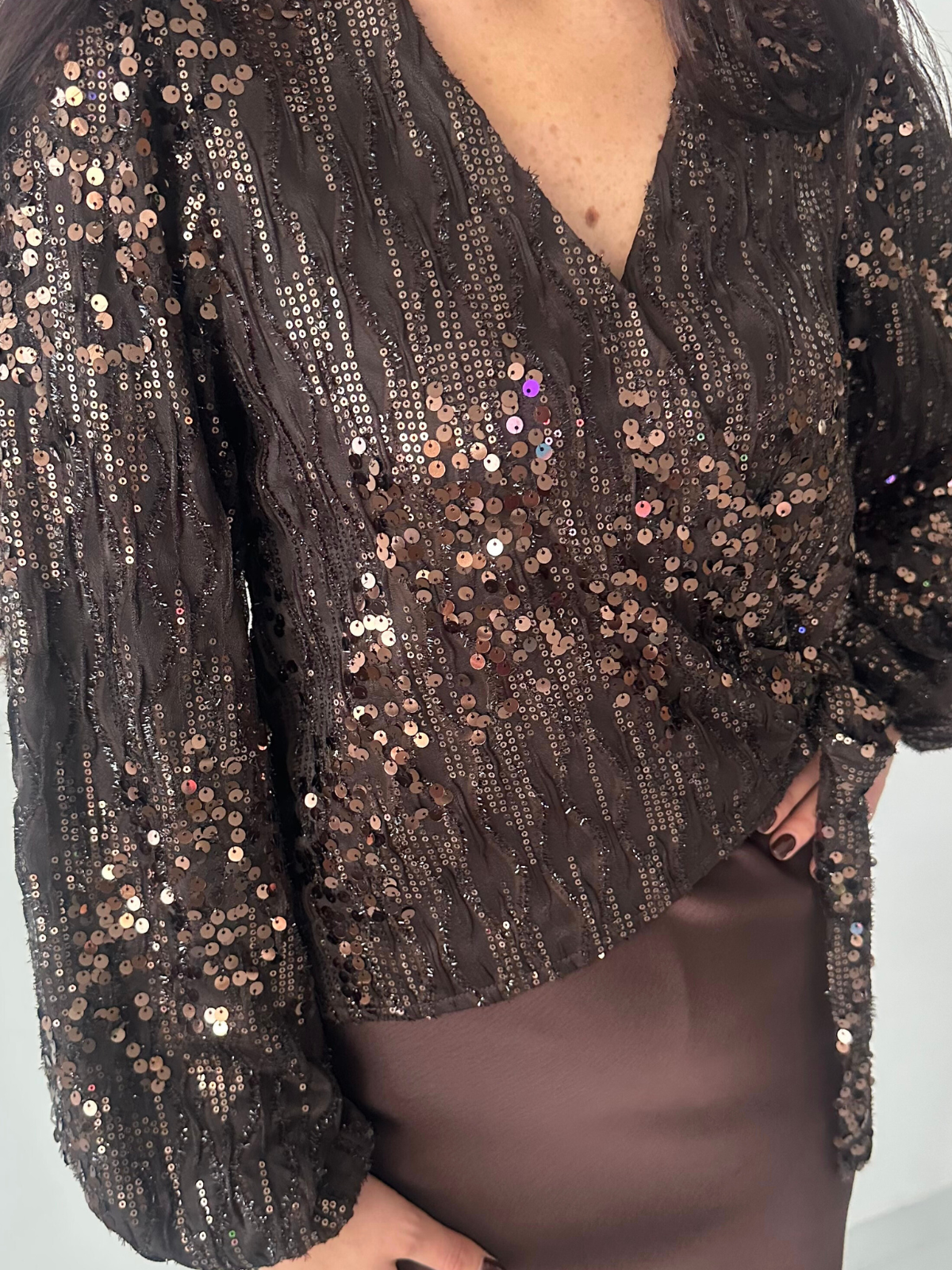 Bruine overslagblouse met pailletten