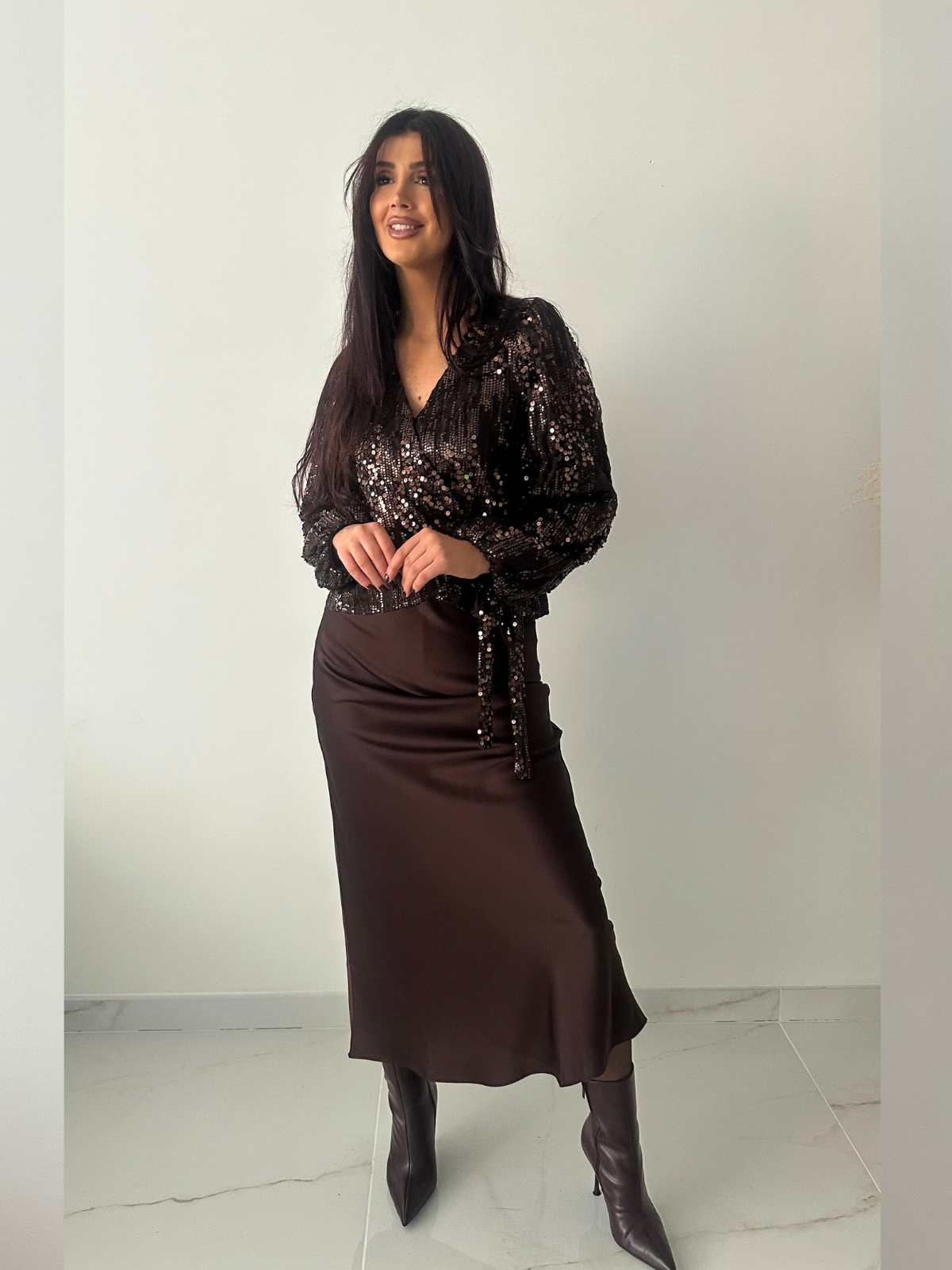 Onze bruine blouse combineert elegantie met een subtiele glamour. Het paillettendetail geeft een feestelijke touch, terwijl het overslagmodel de taille flatteert en je een vrouwelijke silhouet geeft. De blouse kan eenvoudig gesloten worden met een koord aan de taille, waardoor je de fit naar wens kunt aanpassen. Ideaal om te dragen bij een avondje uit, diner of een speciale gelegenheid.