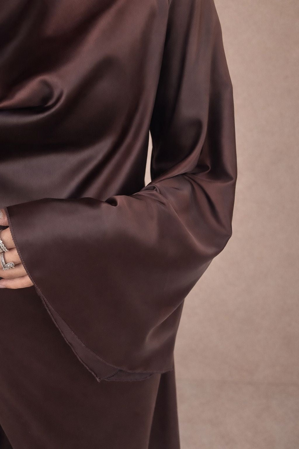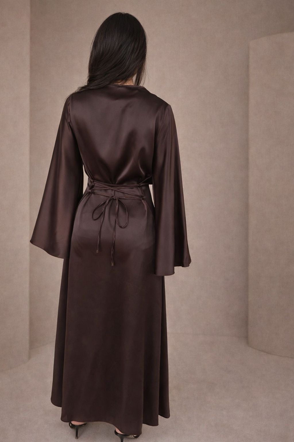 Lange bruine satijn jurk met een mooie pasvorm. De jurk heeft lange mouwen die wijder vallen en een ronde hals. De jurk heeft een koord aan de taille om het aan te spannen. De jurk is een onesize en kan gedragen worden van een S tot een L.