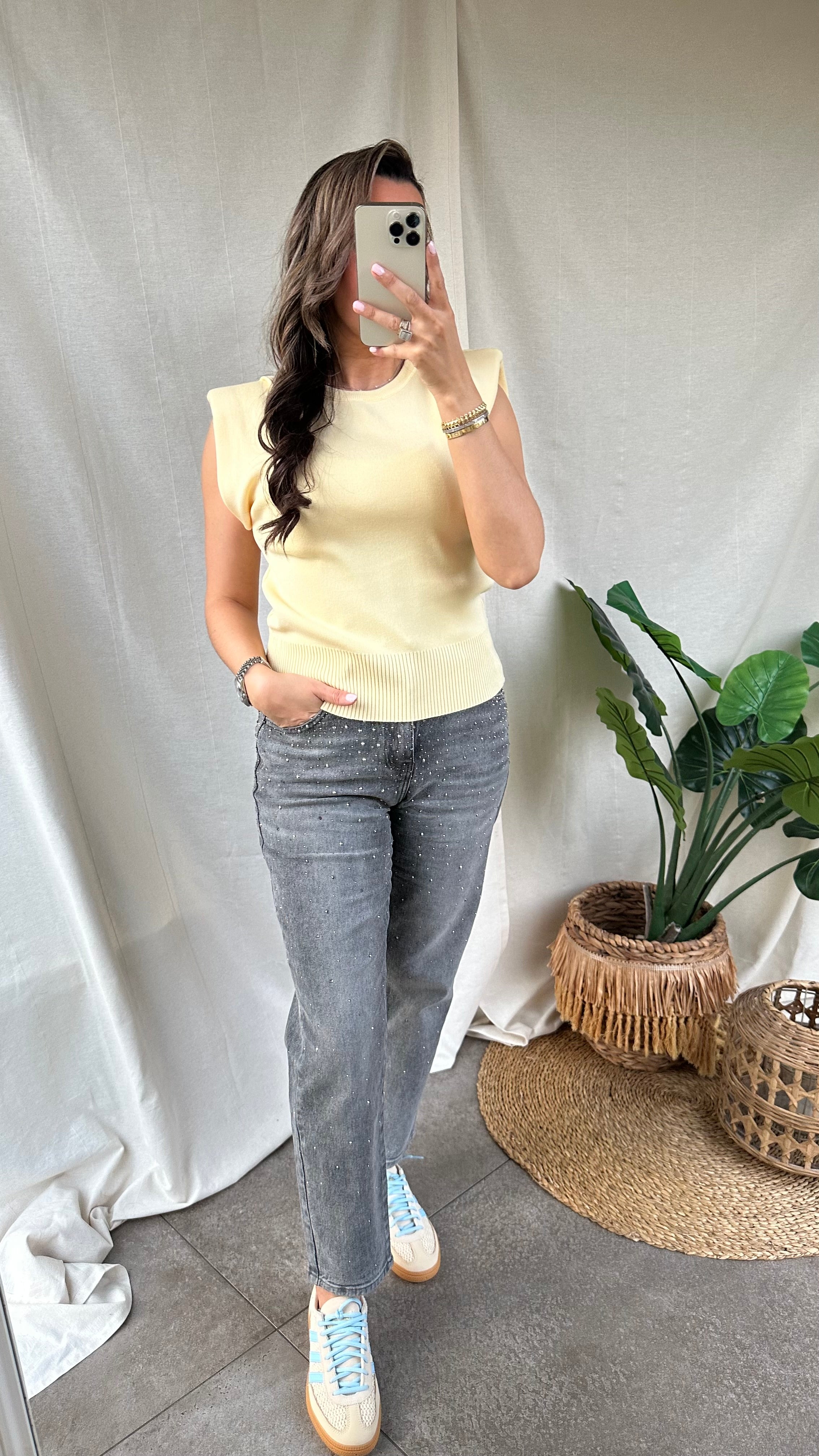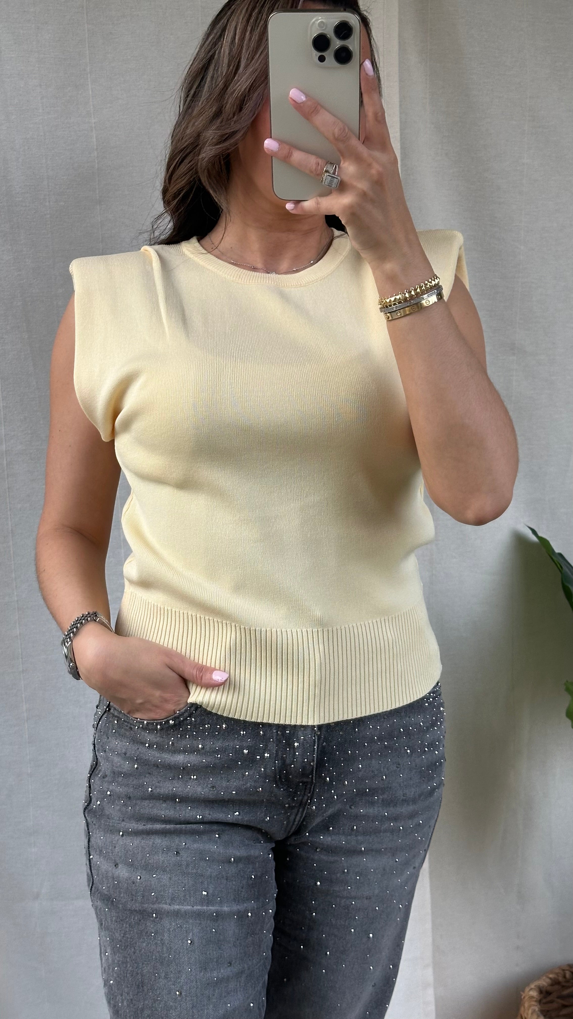 De gele pull heeft een trendy, moderne look. Dit truitje is mouwloos, maar dankzij de schoudervullingen krijgt het item een krachtige en stijlvolle uitstraling. De pull is een onesize en door de stretch kan hij gedragen worden van een XS tot een M.