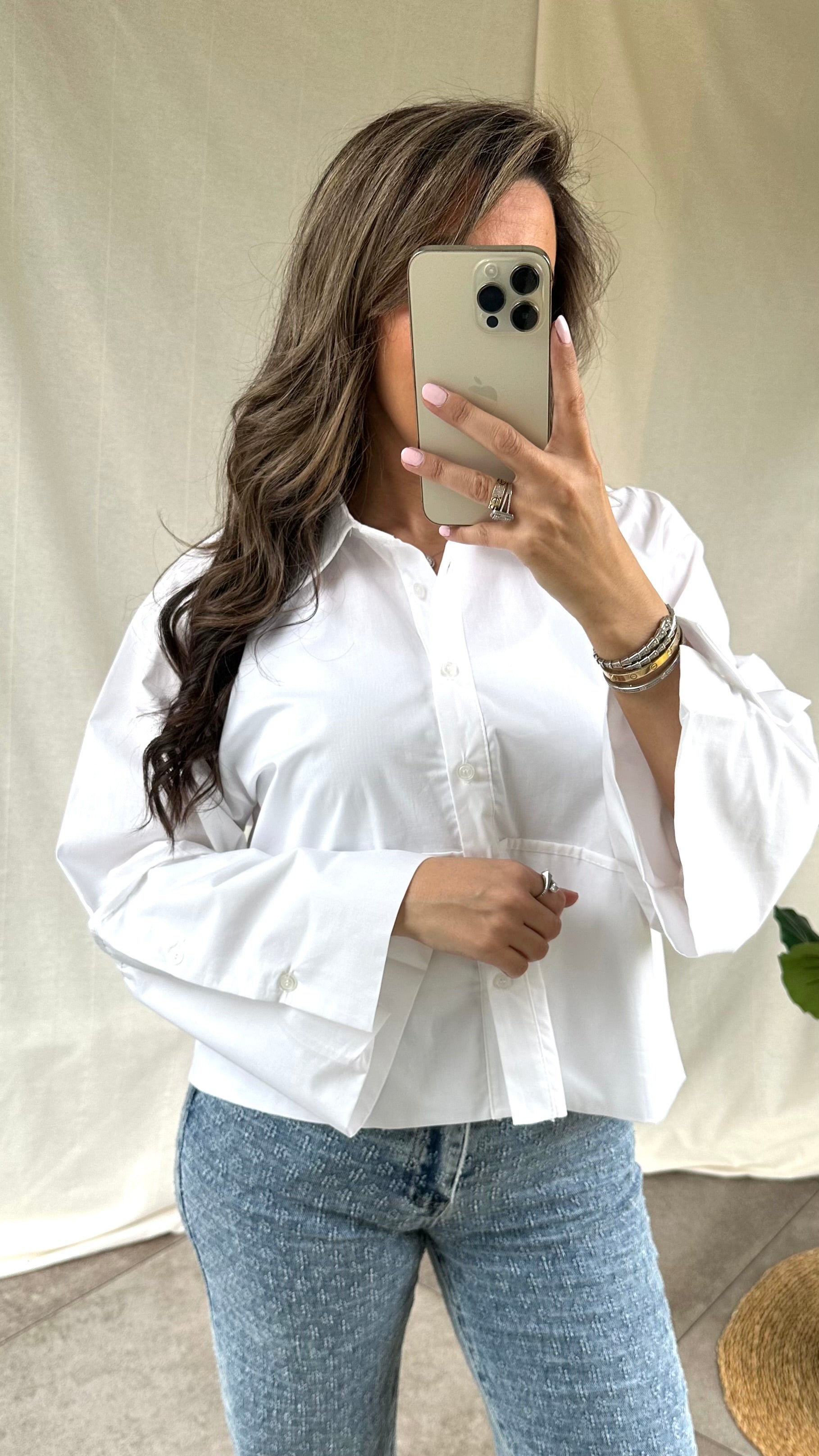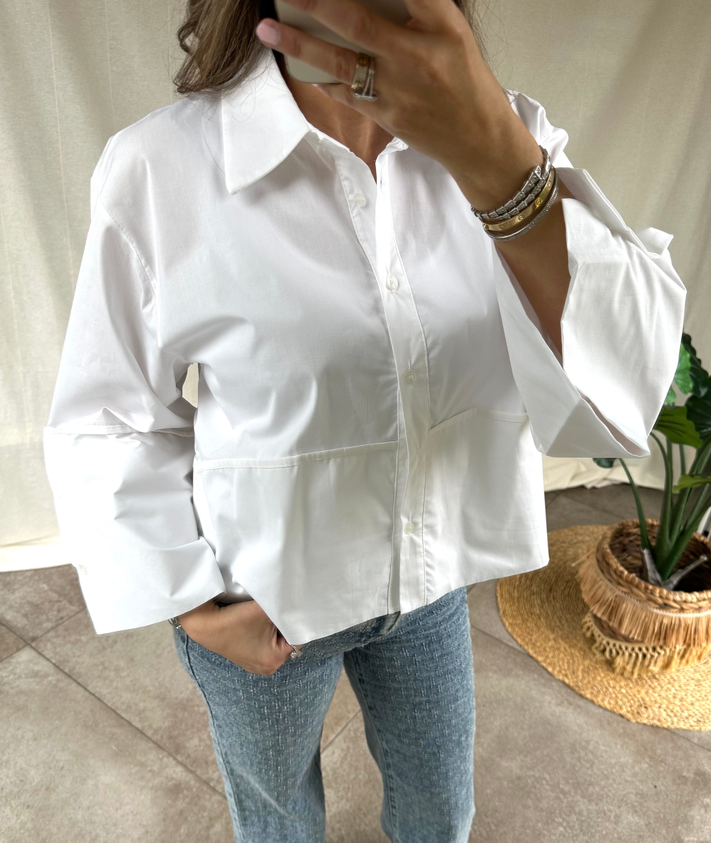 Onze korte oversized hemdje heeft een speelse en trendy look door de mooie brede mouwen. Combineer met een jeans voor een casual chic look. Het hemdje is een onesize en kan gedragen worden van een S tot een L.