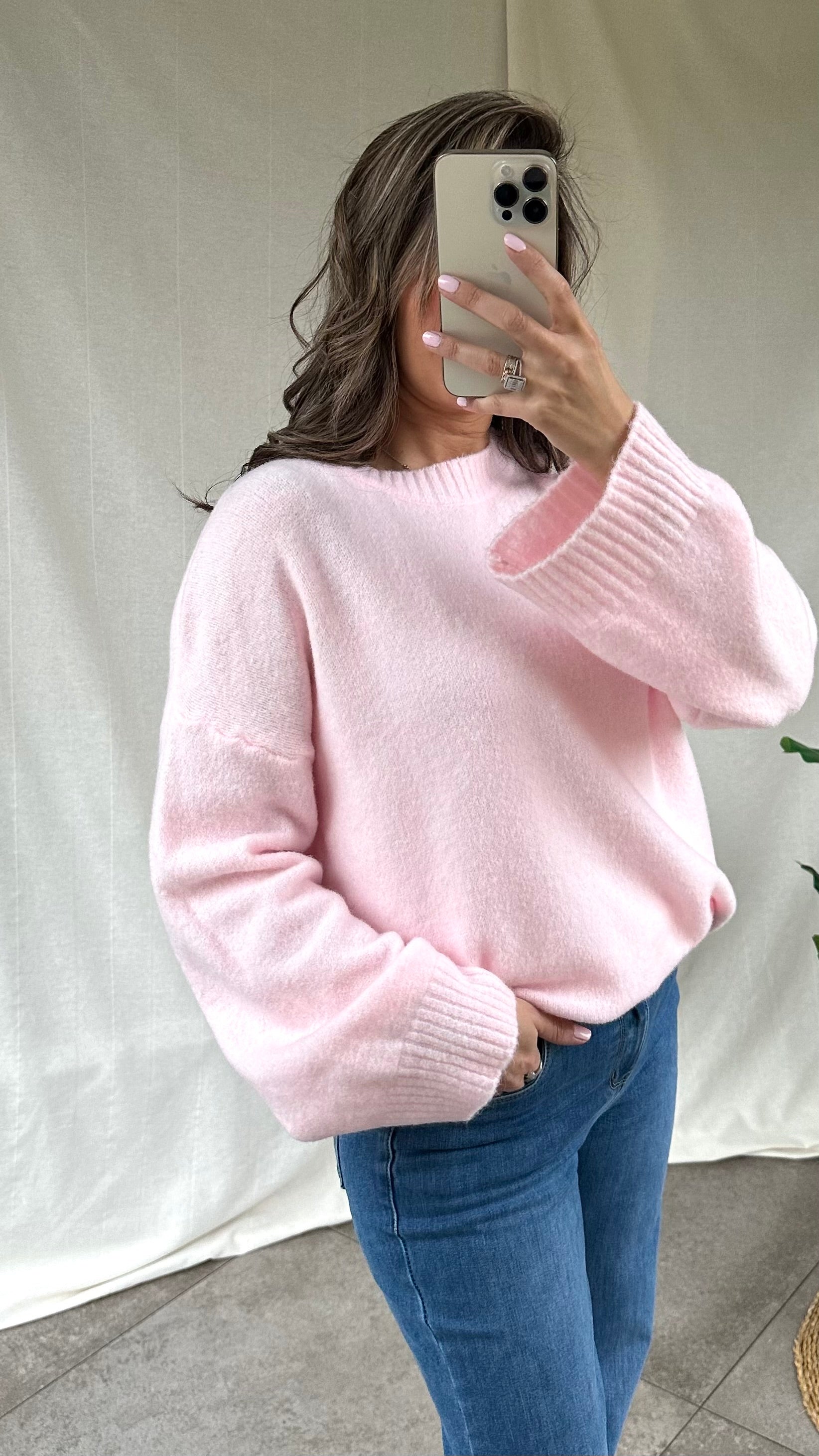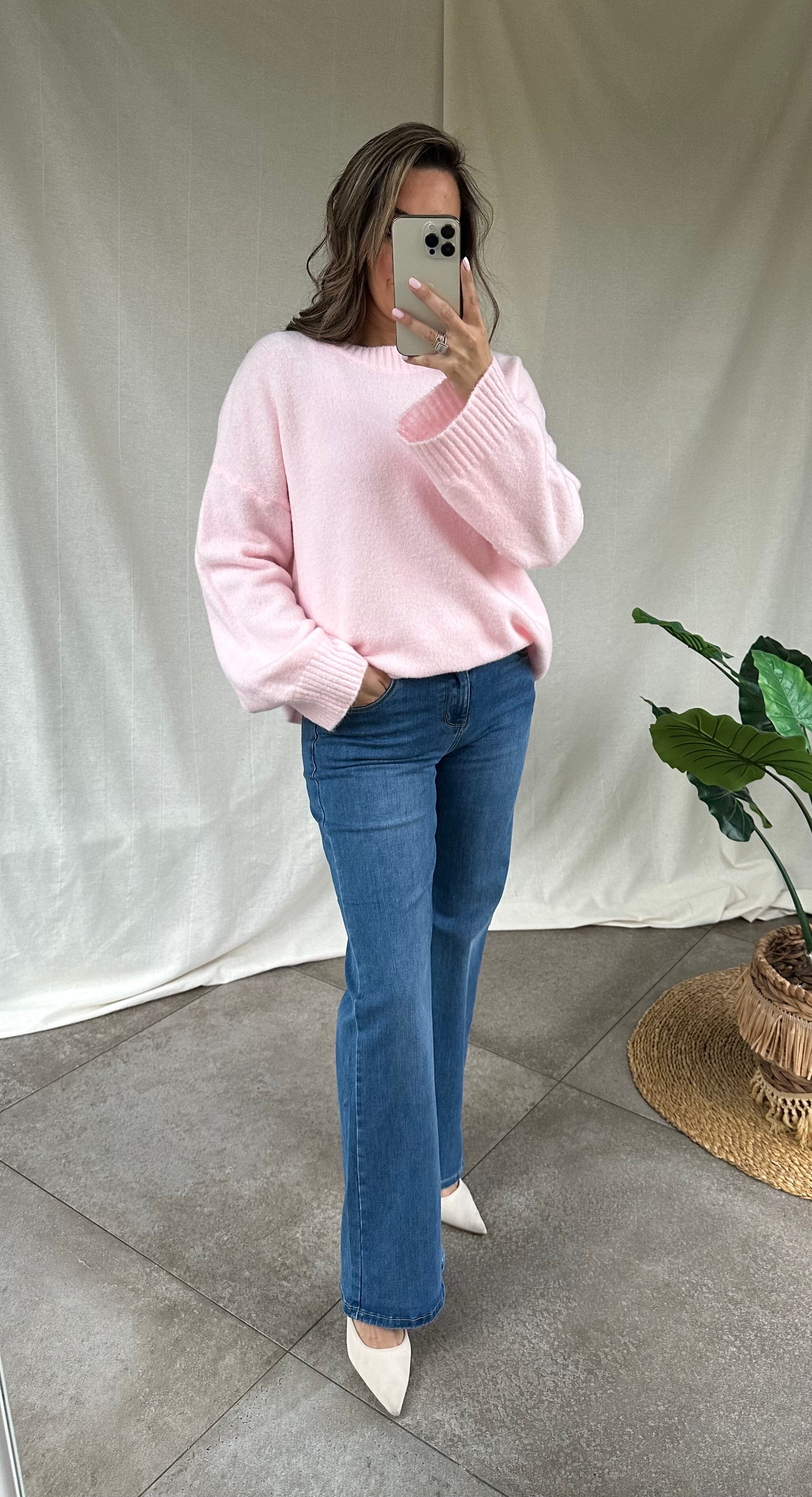 Deze pastel roze pull is een comfortabel en stijlvol item met een moderne oversized uitstraling. De pull heeft een ronde hals en lange mouwen die iets breder vallen, wat zorgt voor een nonchalante en trendy look. De pull is een onesize en kan gedragen worden van een S tot een L.
