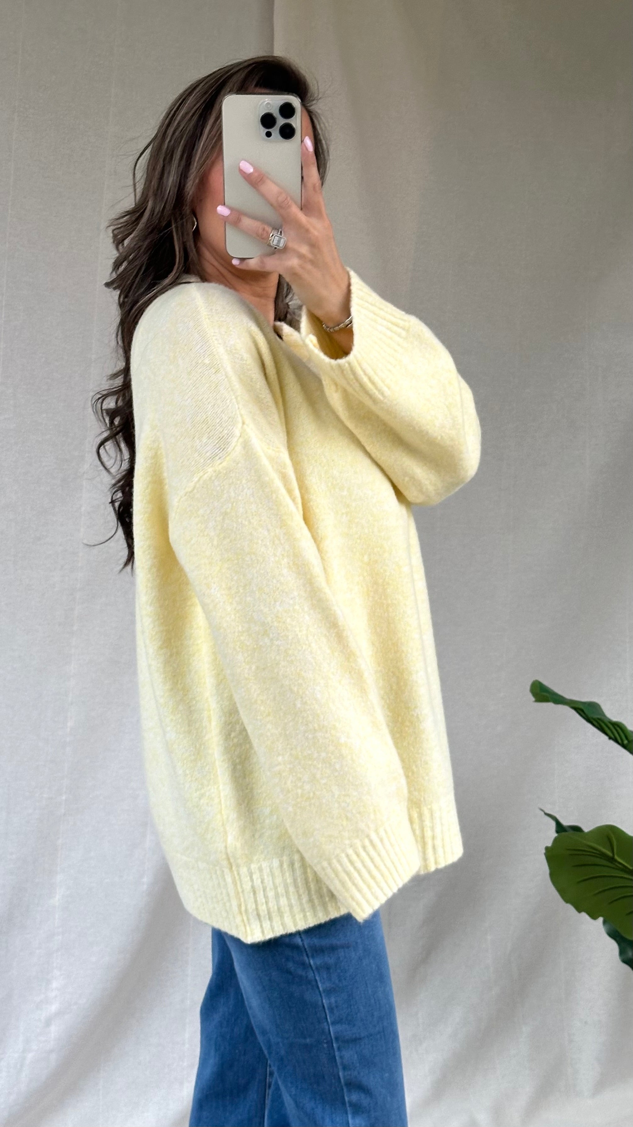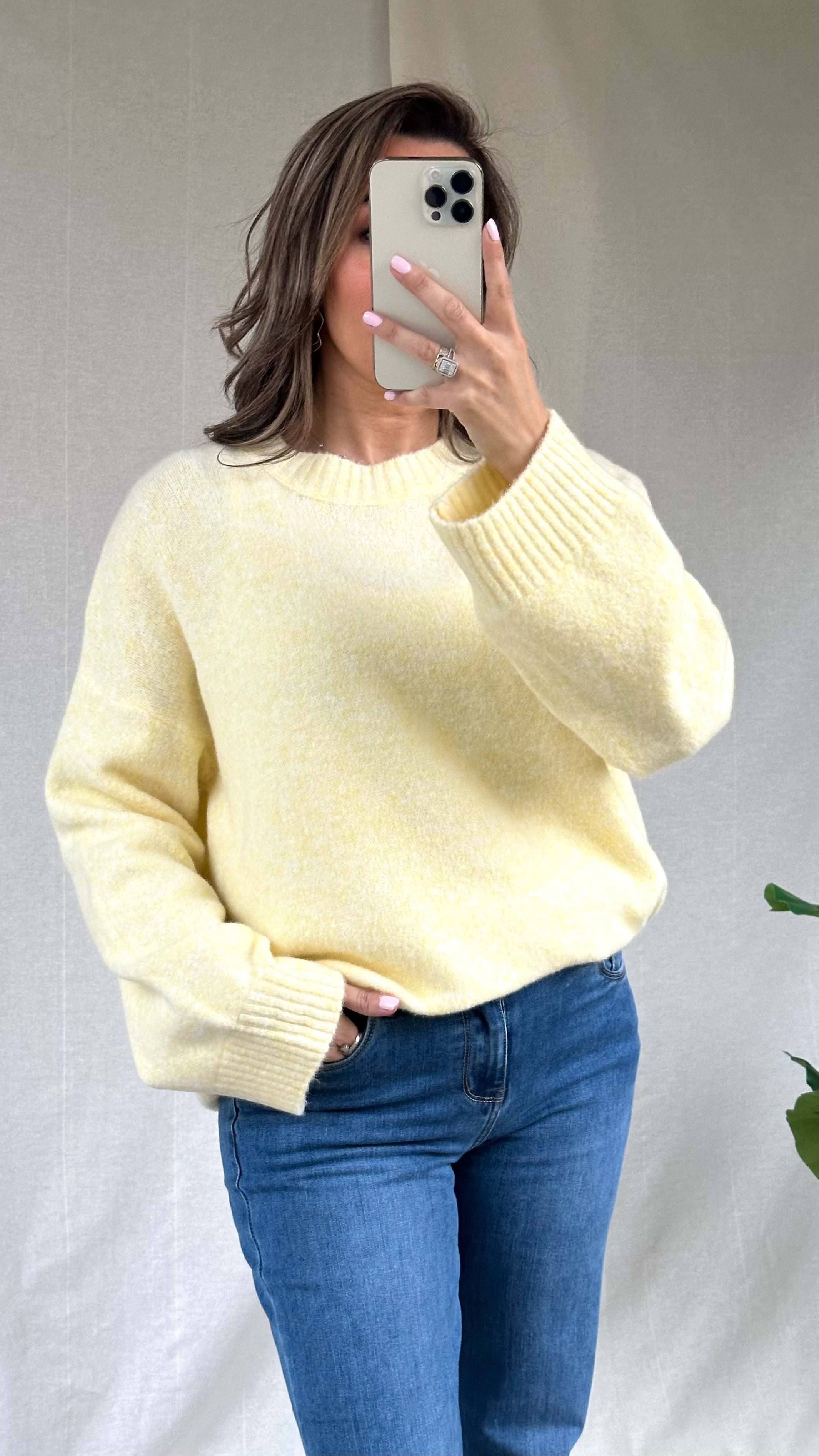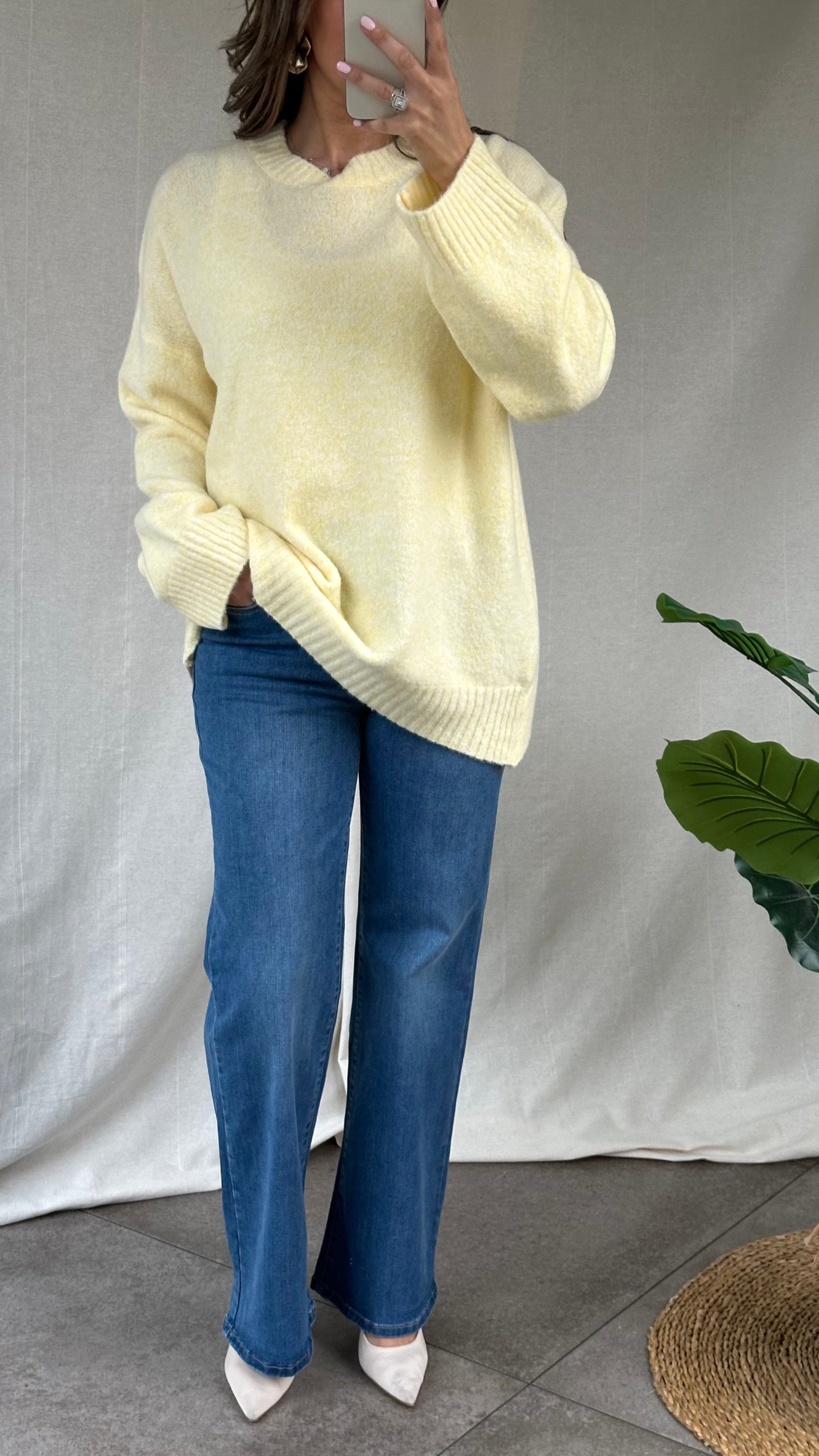 Deze pastel gele pull is een comfortabel en stijlvol item met een moderne oversized uitstraling. De pull heeft een ronde hals en lange mouwen die iets breder vallen, wat zorgt voor een nonchalante en trendy look. De pull is een onesize en kan gedragen worden van een S tot een L.