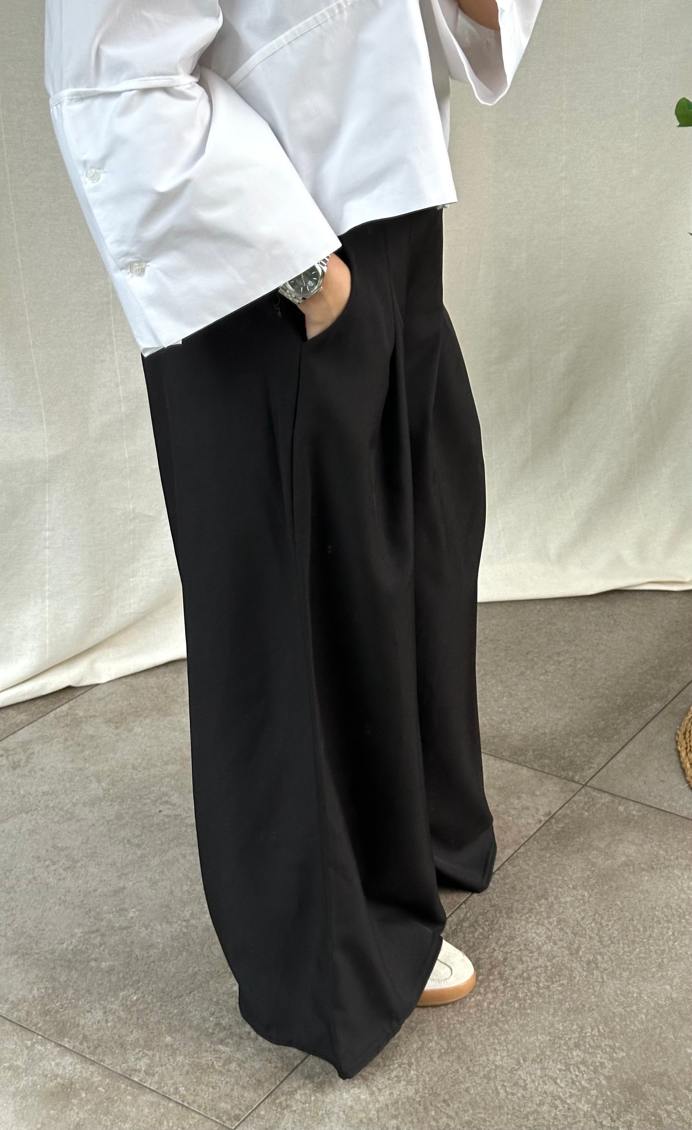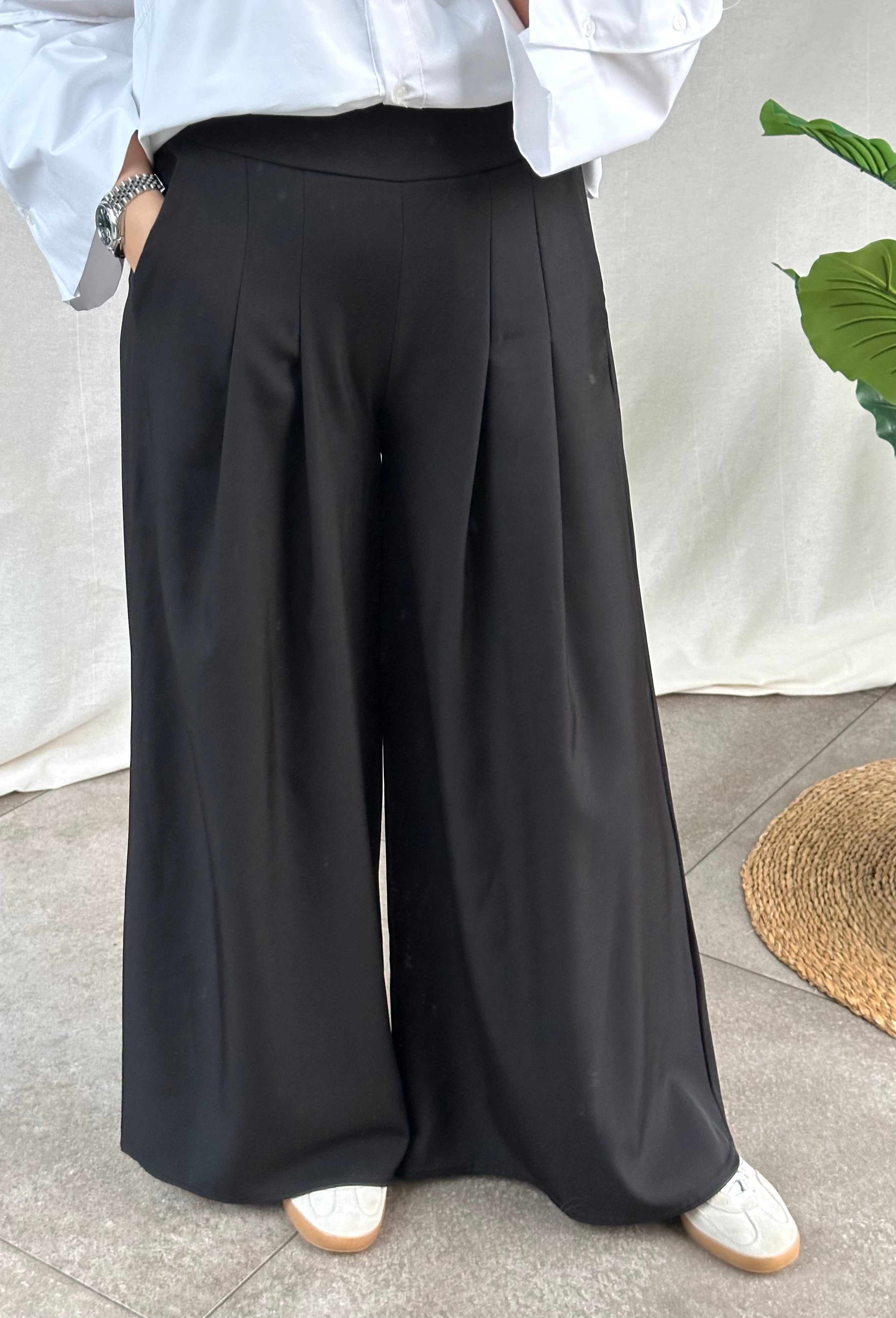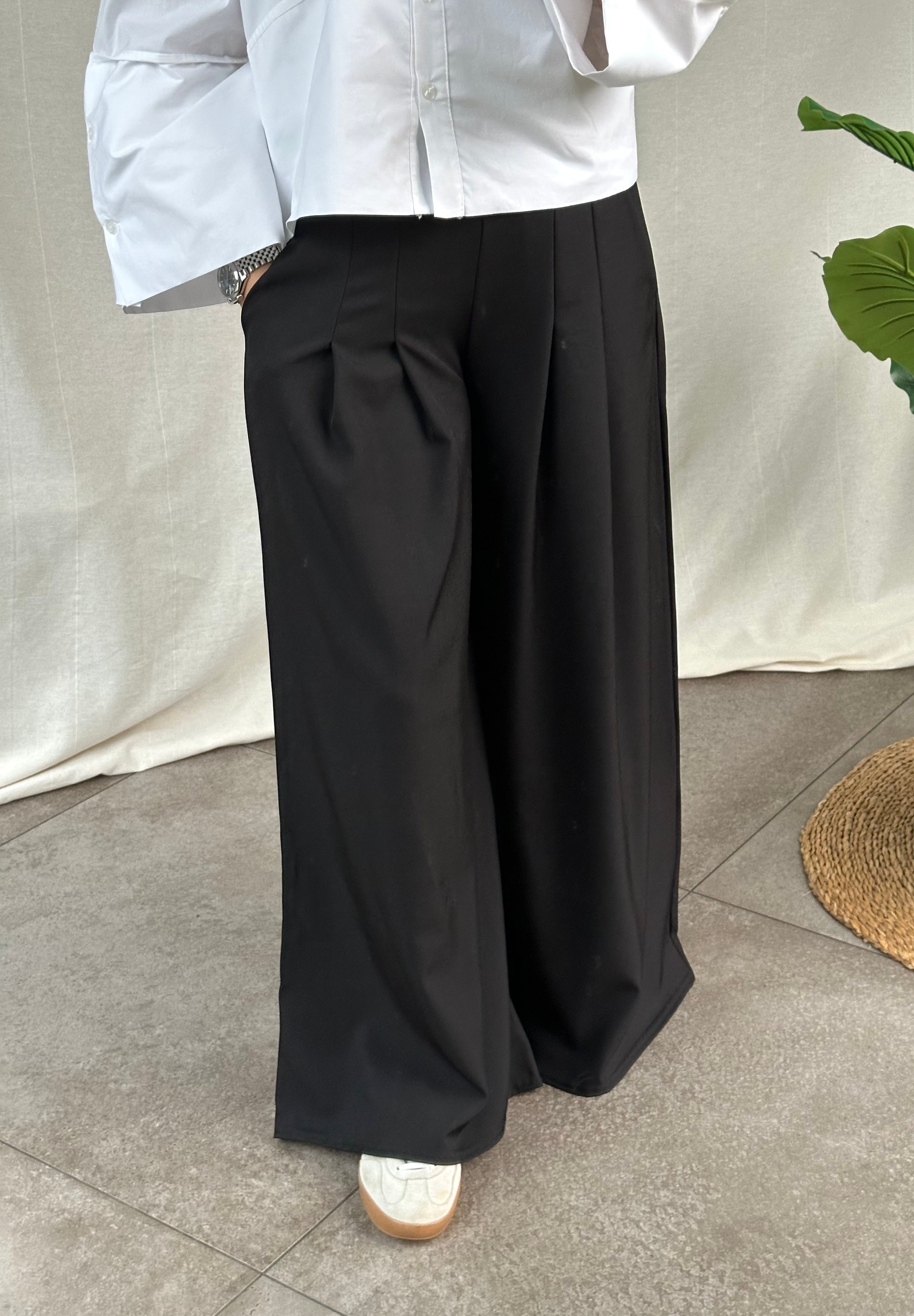 Zwarte klassieke broek met wijde pijpen, zakjes en een elastische tailleband voor extra comfort. De broek is een onesize en kan gedragen worden van een S tot L.