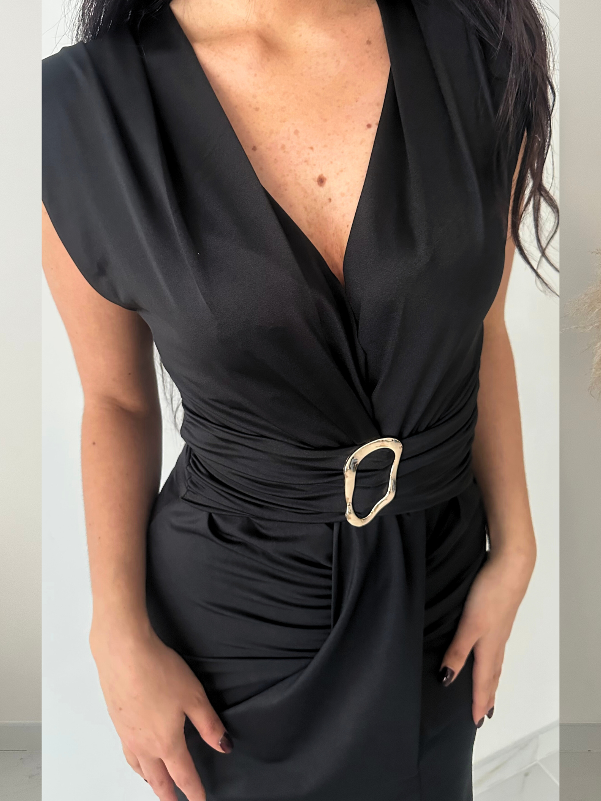 Deze zwarte glanzende jurk is de perfecte mix van elegantie en moderne flair. Het gouden detail aan de taille zorgt voor een luxe accent dat je silhouet mooi benadrukt.