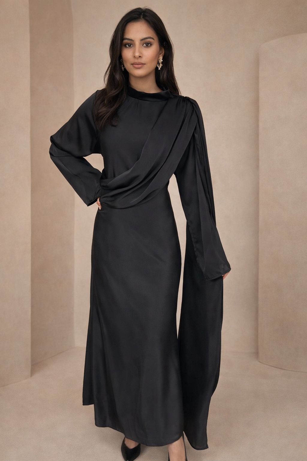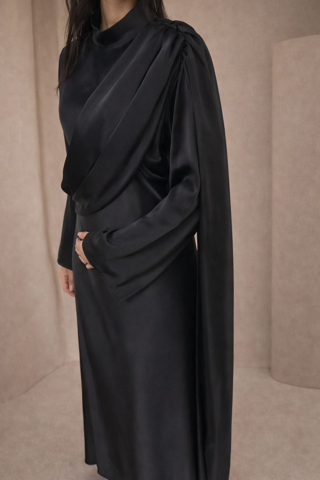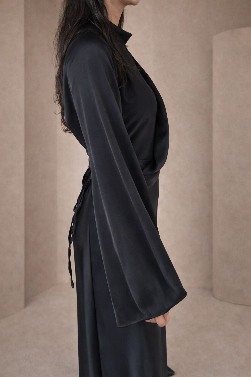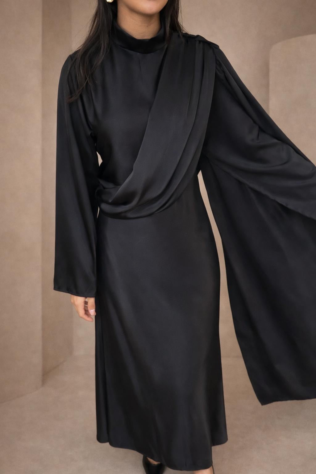 Lange zwarte satijn jurk met een mooie pasvorm. De jurk heeft lange mouwen en een ronde hals. De jurk heeft een koord aan de taille om het aan te spannen en een elegante gedrapeerde stuk aan de voorzijde. De jurk is een onesize en kan gedragen worden van een S tot een L.