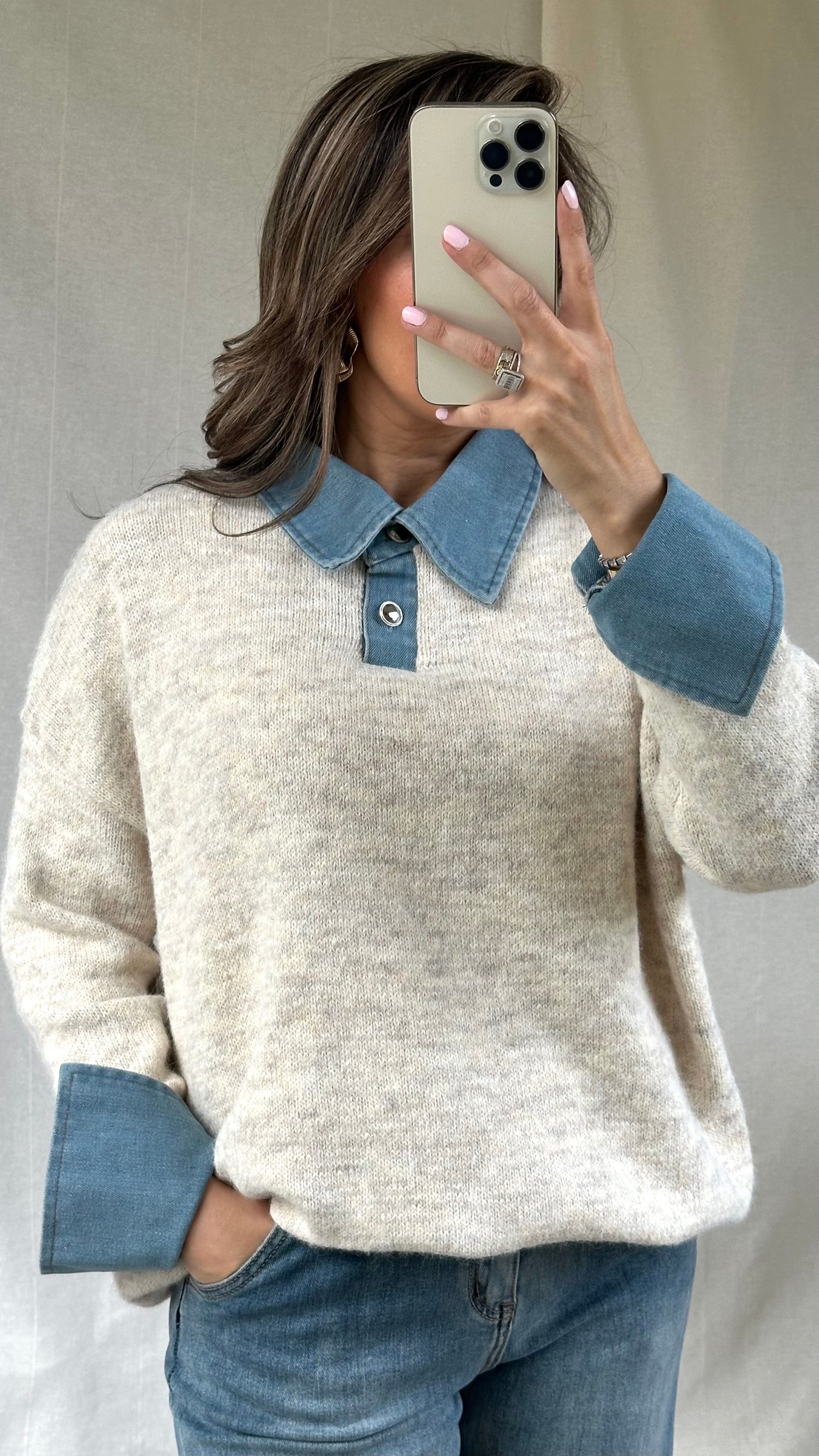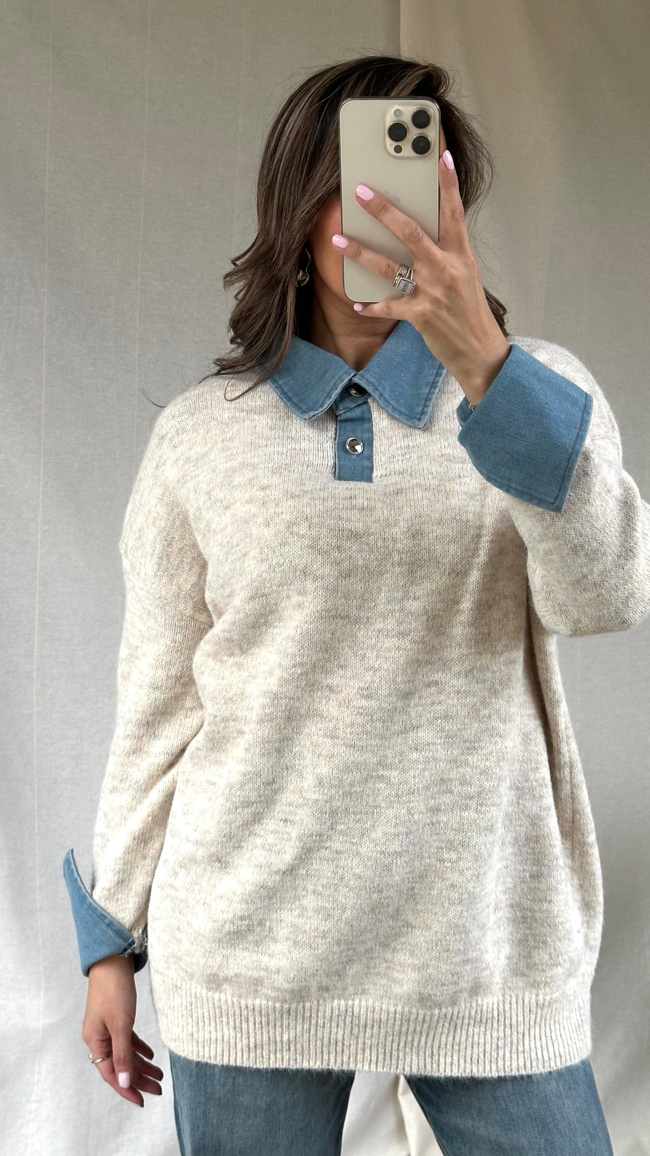 Deze stijlvolle pull is een langer model en perfect voor een casual maar verzorgde look. De pull heeft knoopjes aan de bovenkant, afgewerkt met een jeanskraagje. Ook aan de polsen is een subtiel denim detail verwerkt. De pull is een onesize en kan gedragen worden van een S tot een L.