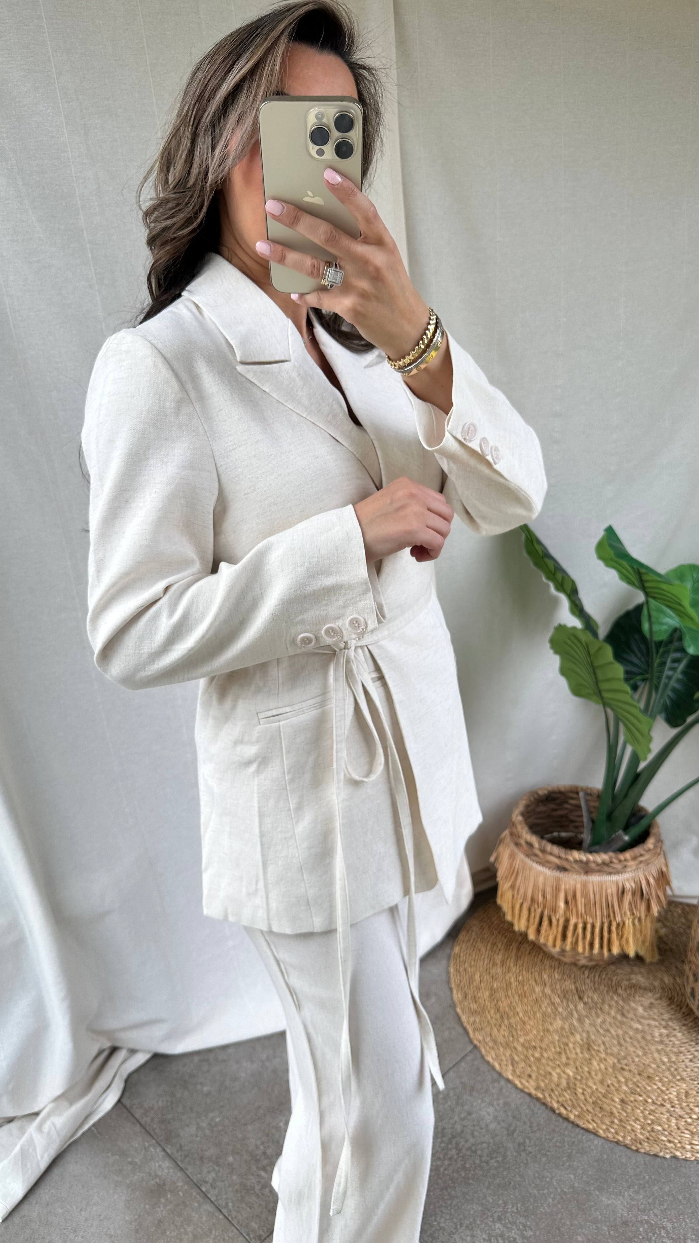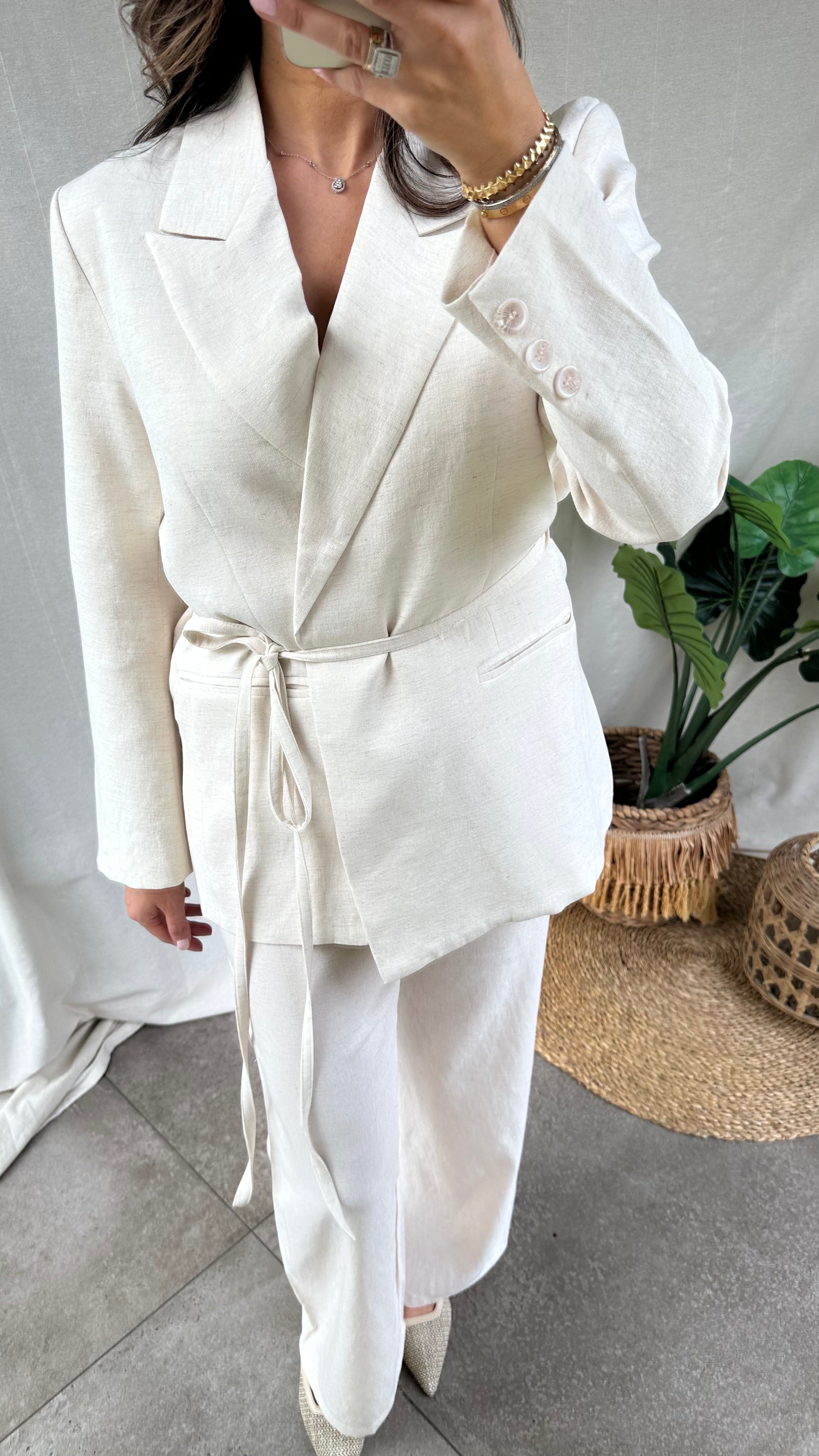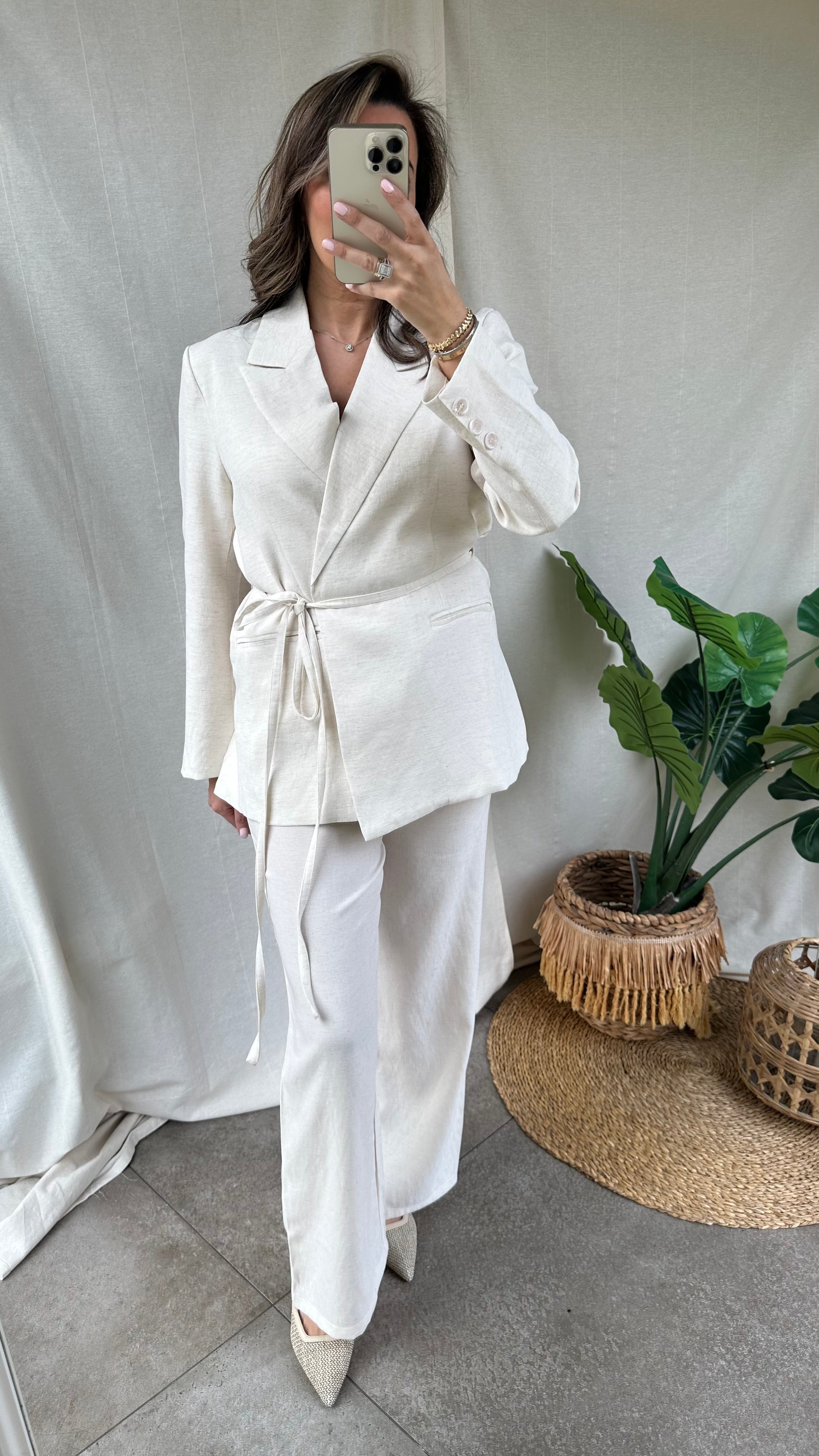 Dit beige linnen setje is een elegant en modern setje. Het bestaat uit een broek met rechte pijpen en een getailleerde blazer die voorzien is voor een koord waarmee je de blazer kunt dichtknopen en je silhouet mooi accentueert. Het setje is gemaakt van lichtgewicht linnen, wat zorgt voor comfort en een luxe uitstraling.