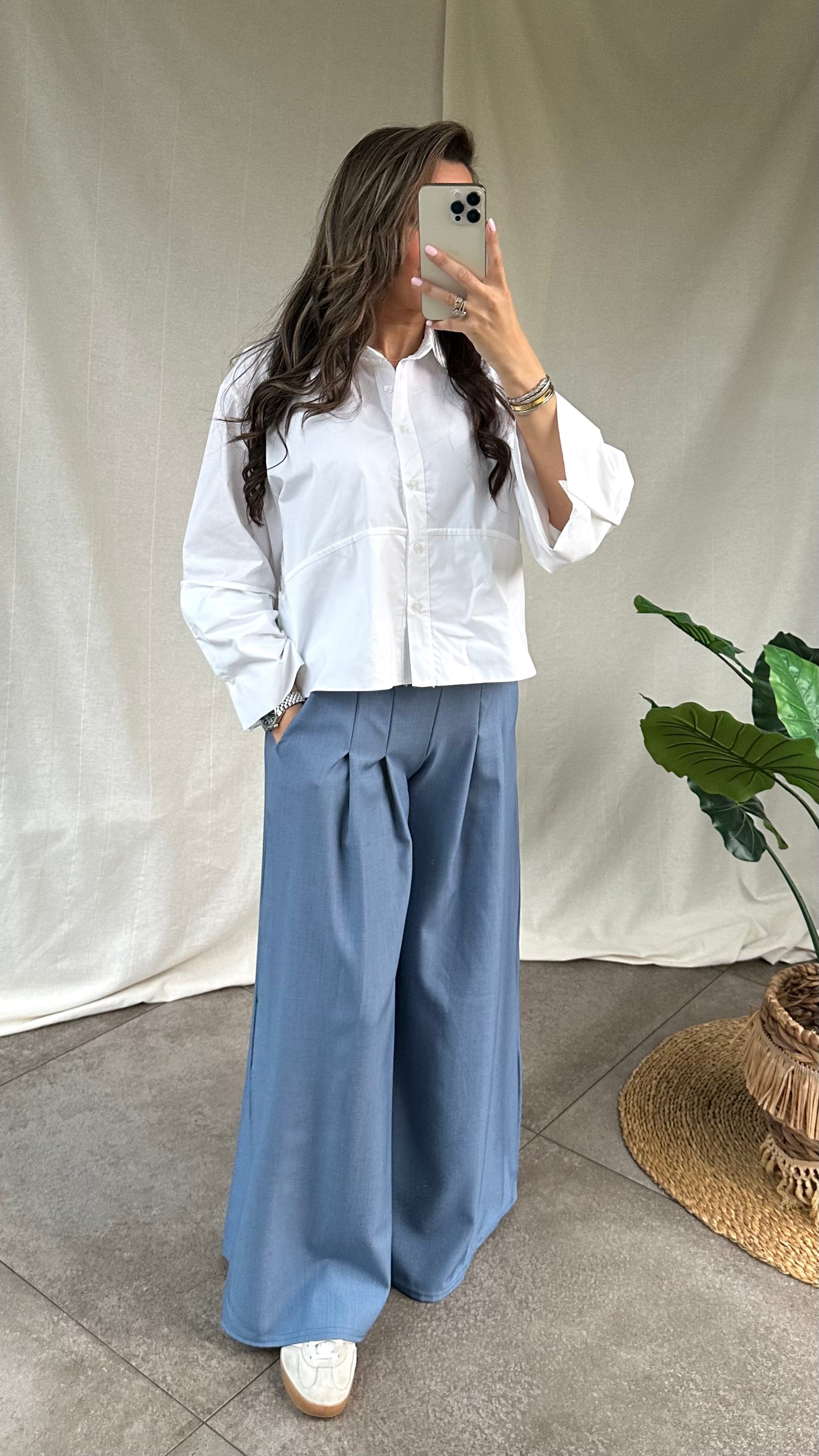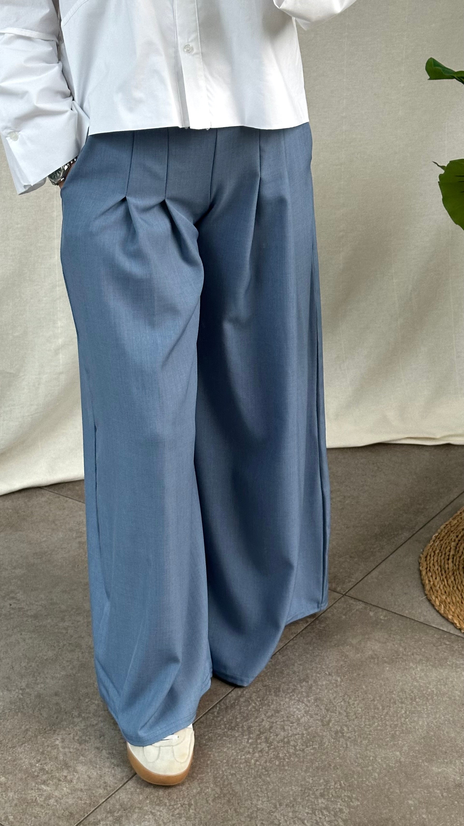 Blauwe klassieke broek met wijde pijpen, zakjes en een elastische tailleband voor extra comfort. De broek is een onesize en kan gedragen worden van een S tot L.
