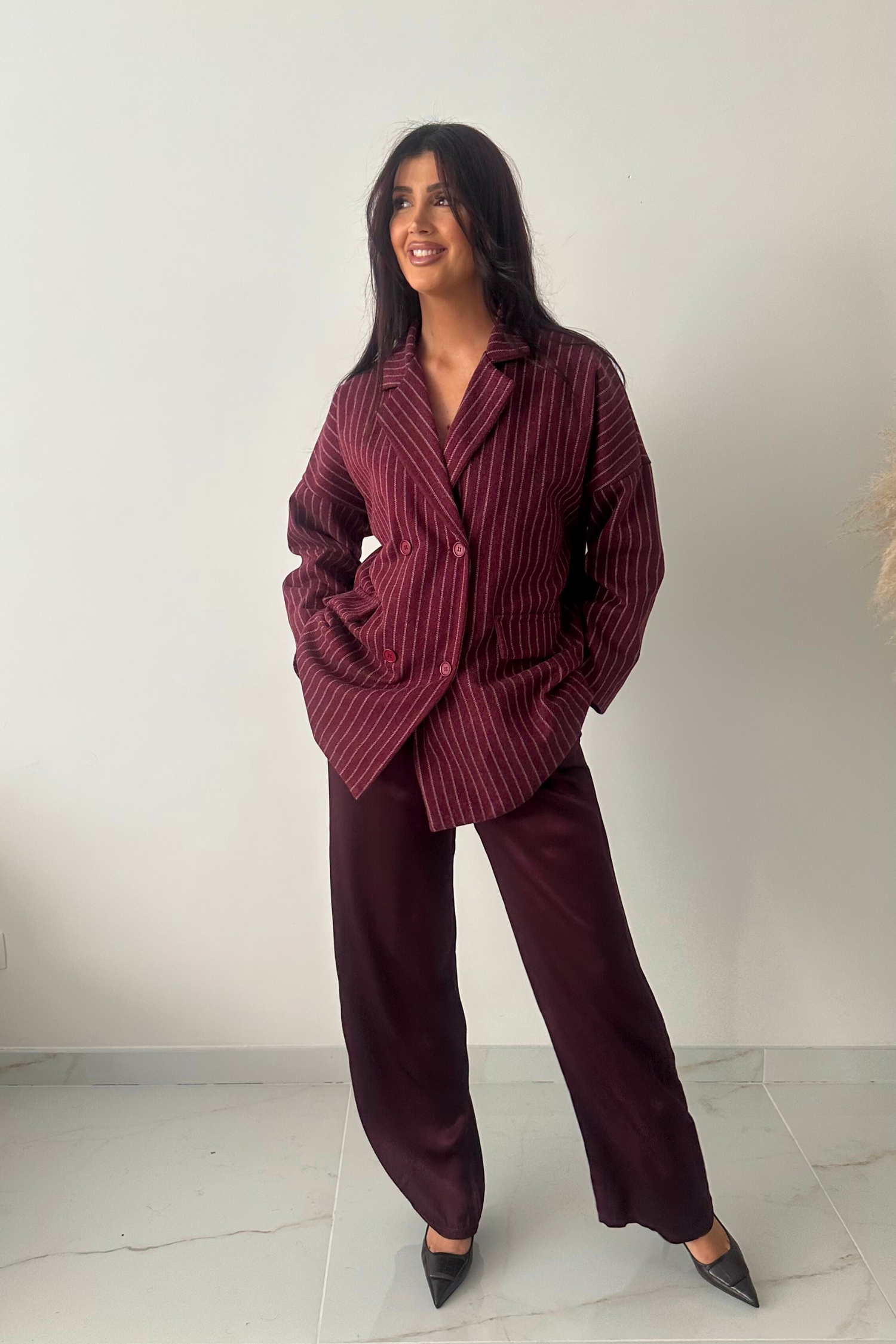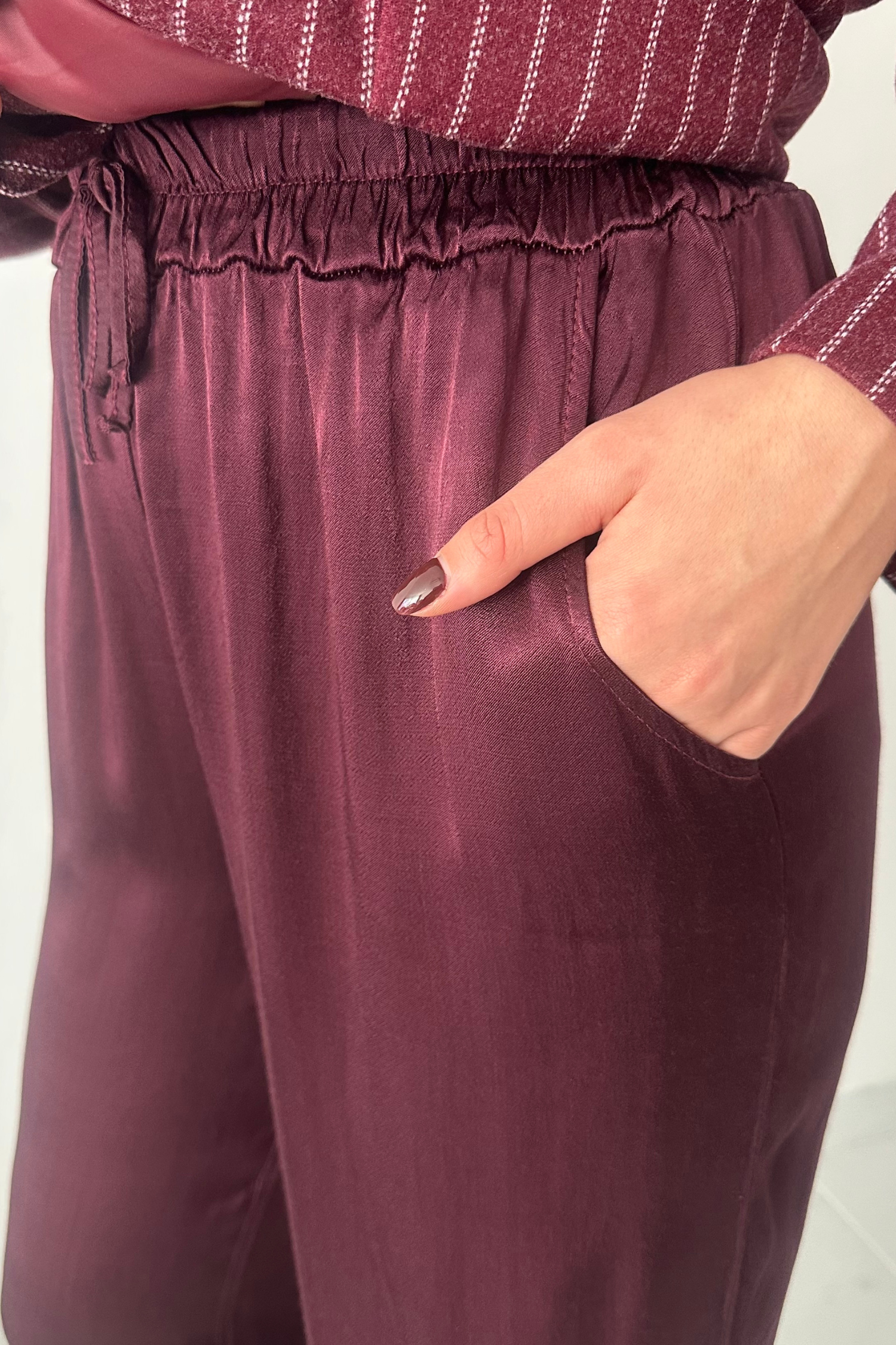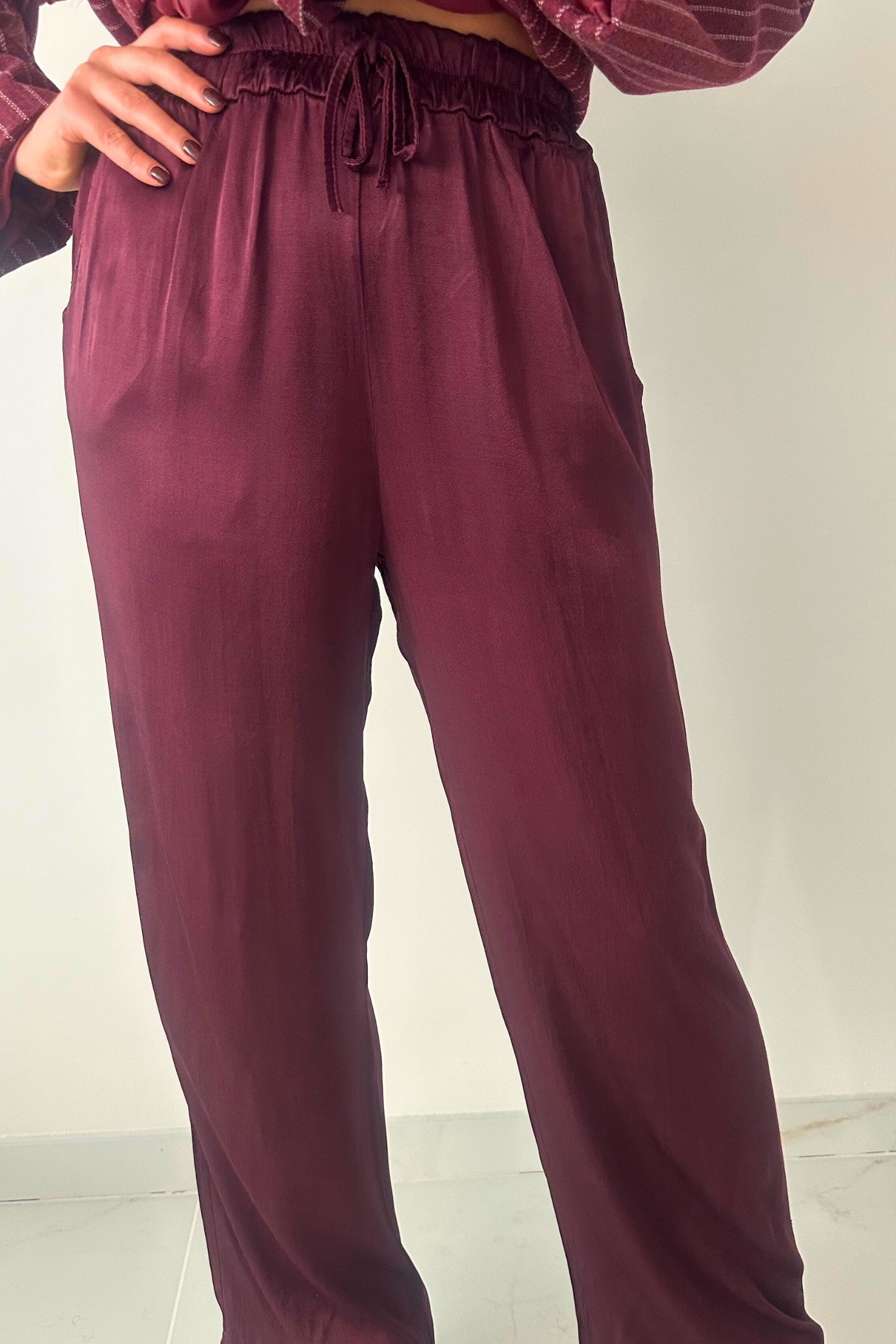 Voel je comfortabel en stijlvol met onze bordeaux satijnen broek. Het model heeft een brede pasvorm en een elastische band aan de taille, waardoor hij heerlijk zit en makkelijk aan- en uit te trekken is. Dankzij de luxueuze satijnen stof krijgt de broek een elegante glans en een verfijnde uitstraling, perfect voor zowel casual als chique outfits.