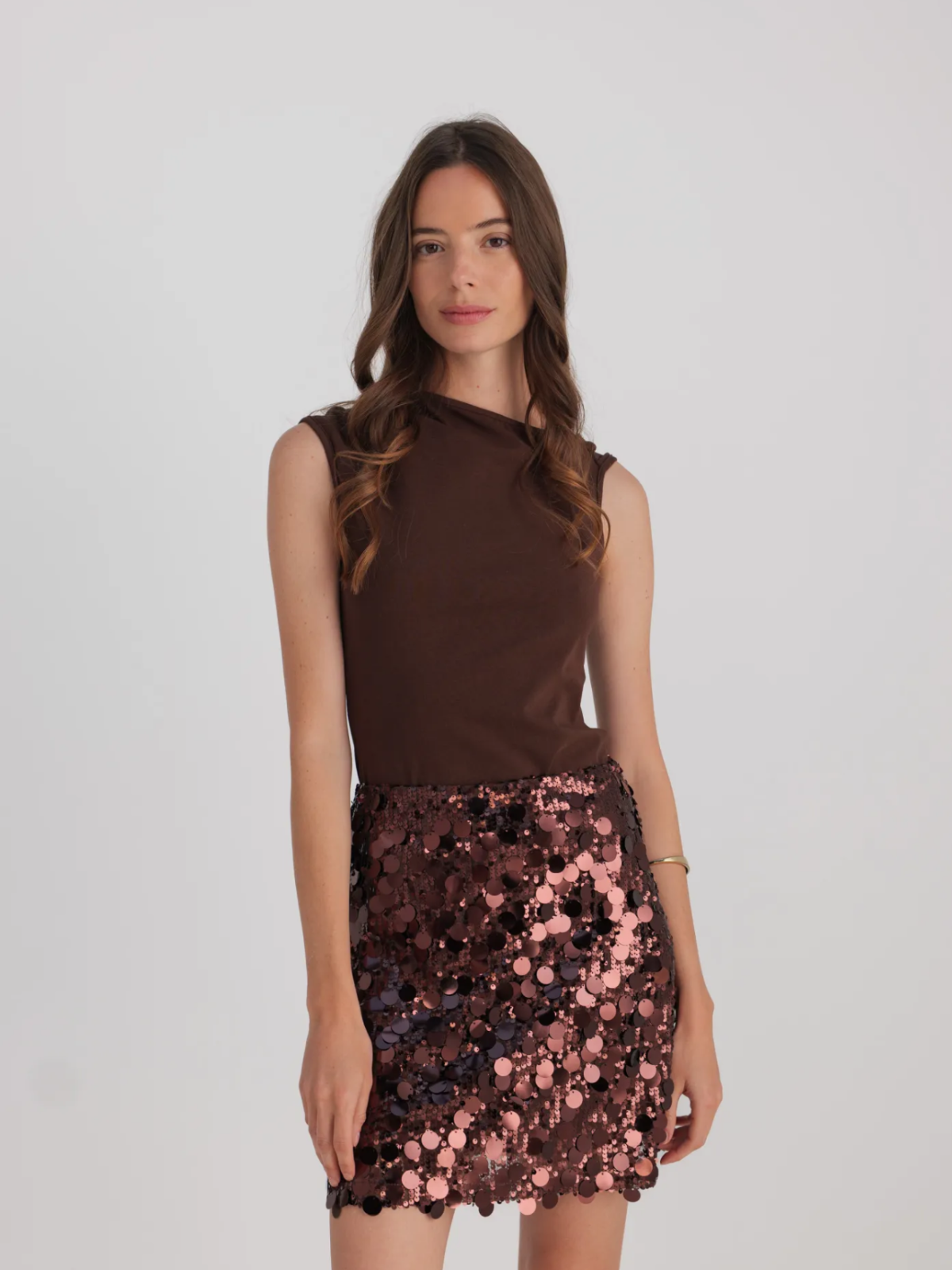 Onze bruine minirok met pailletten is perfect voor de feestdagen of een avondje uit. De ritssluiting aan de achterkant zorgt voor een nette afwerking en gemakkelijk aan- en uitkleden. Een ideale keuze om je feestlook compleet te maken!