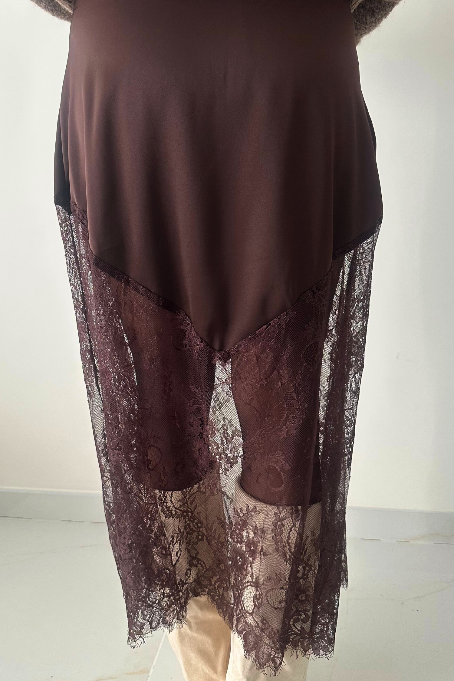 Deze lange satijnrok in het bruin straalt elegantie uit. Het satijnen materiaal geeft een luxueuze glans, terwijl het kanten detail vanaf de knie naar beneden een verfijnde en vrouwelijke touch toevoegt. De rok heeft een ritssluiting aan de zijkant.
