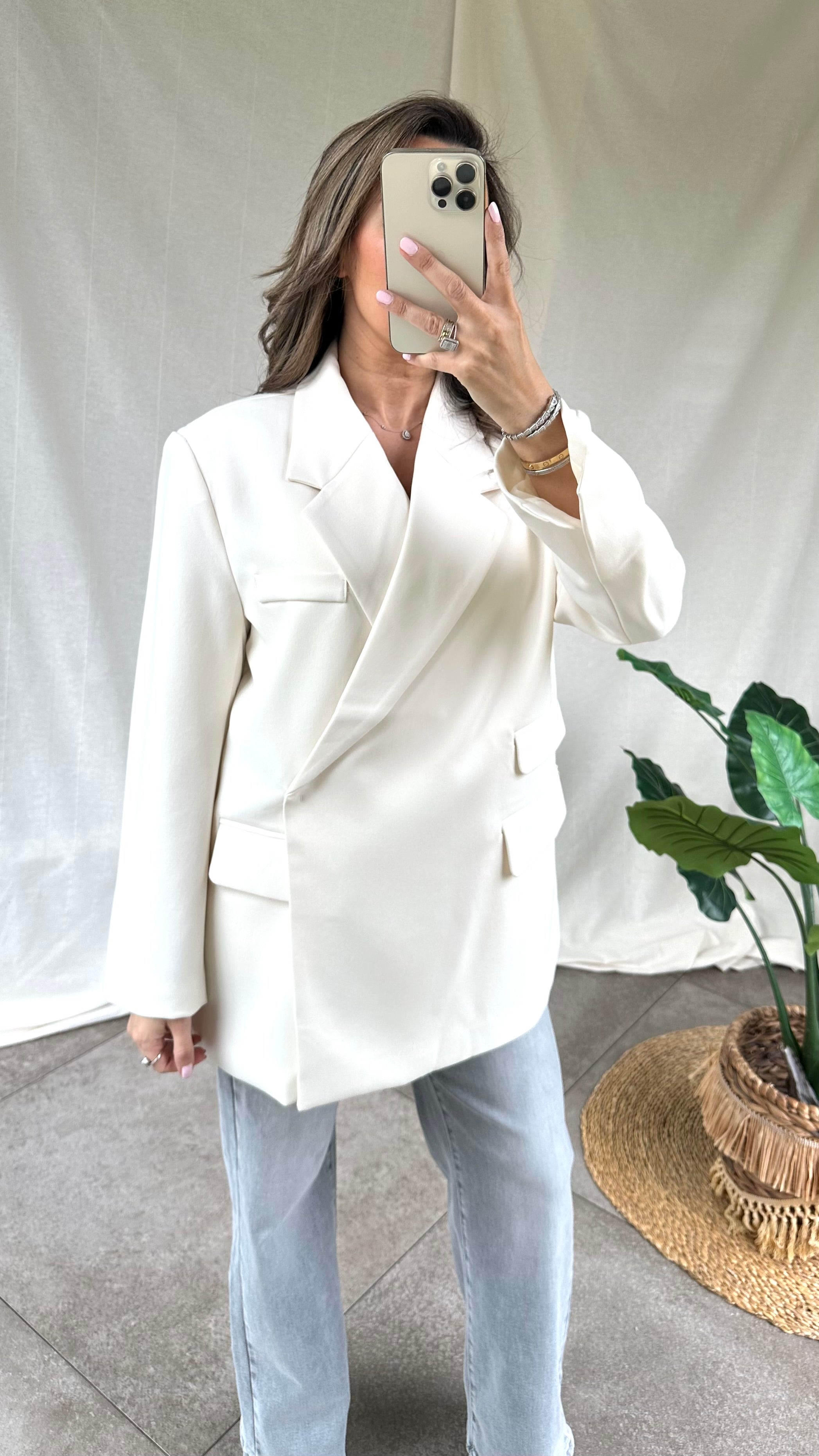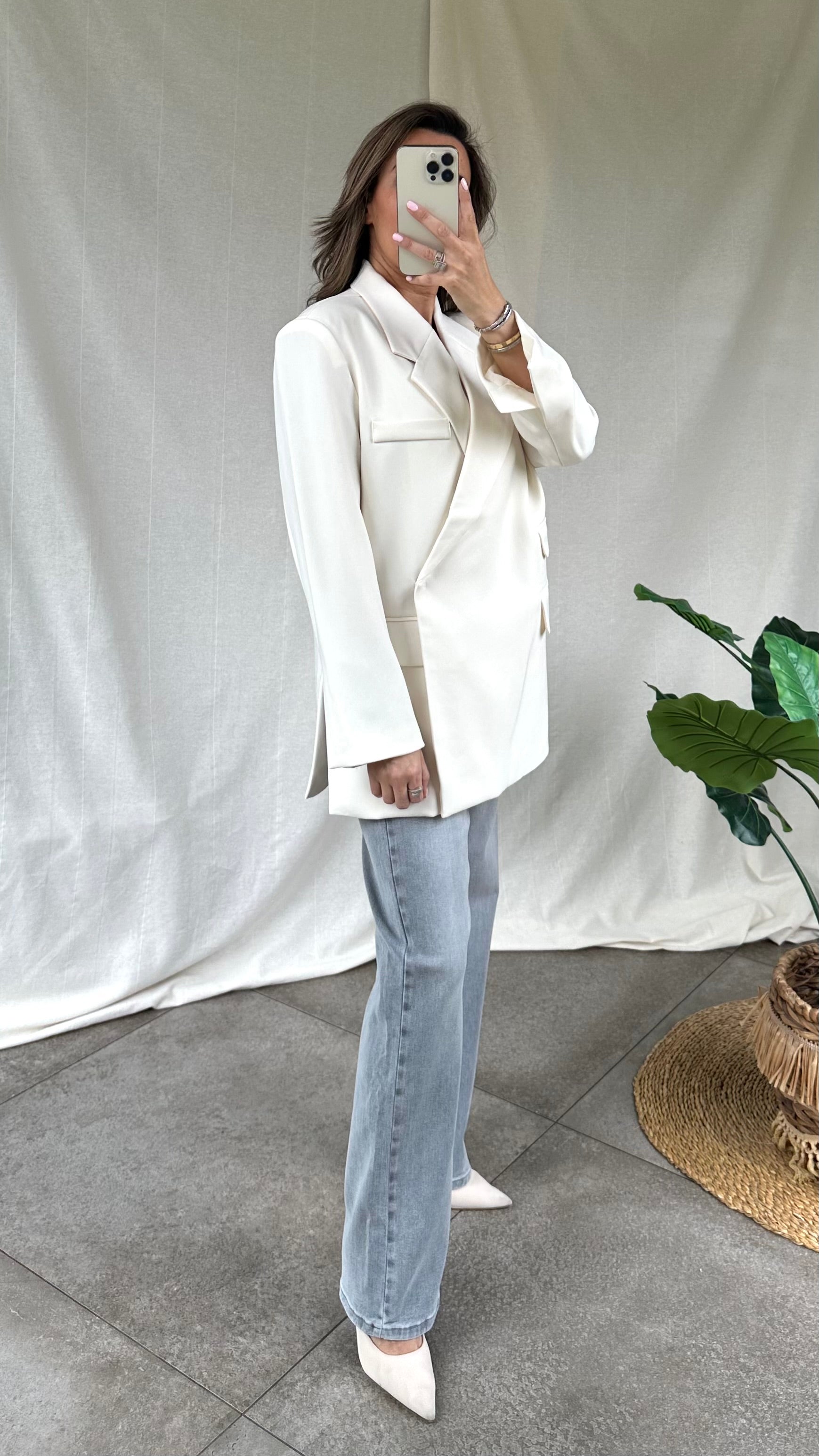 Trendy ecru blazer met twee stijlvolle zakjes aan één zijde en een elegante sluiting aan de zijkant, een echt musthave in jouw garderobe. De blazer valt oversized.