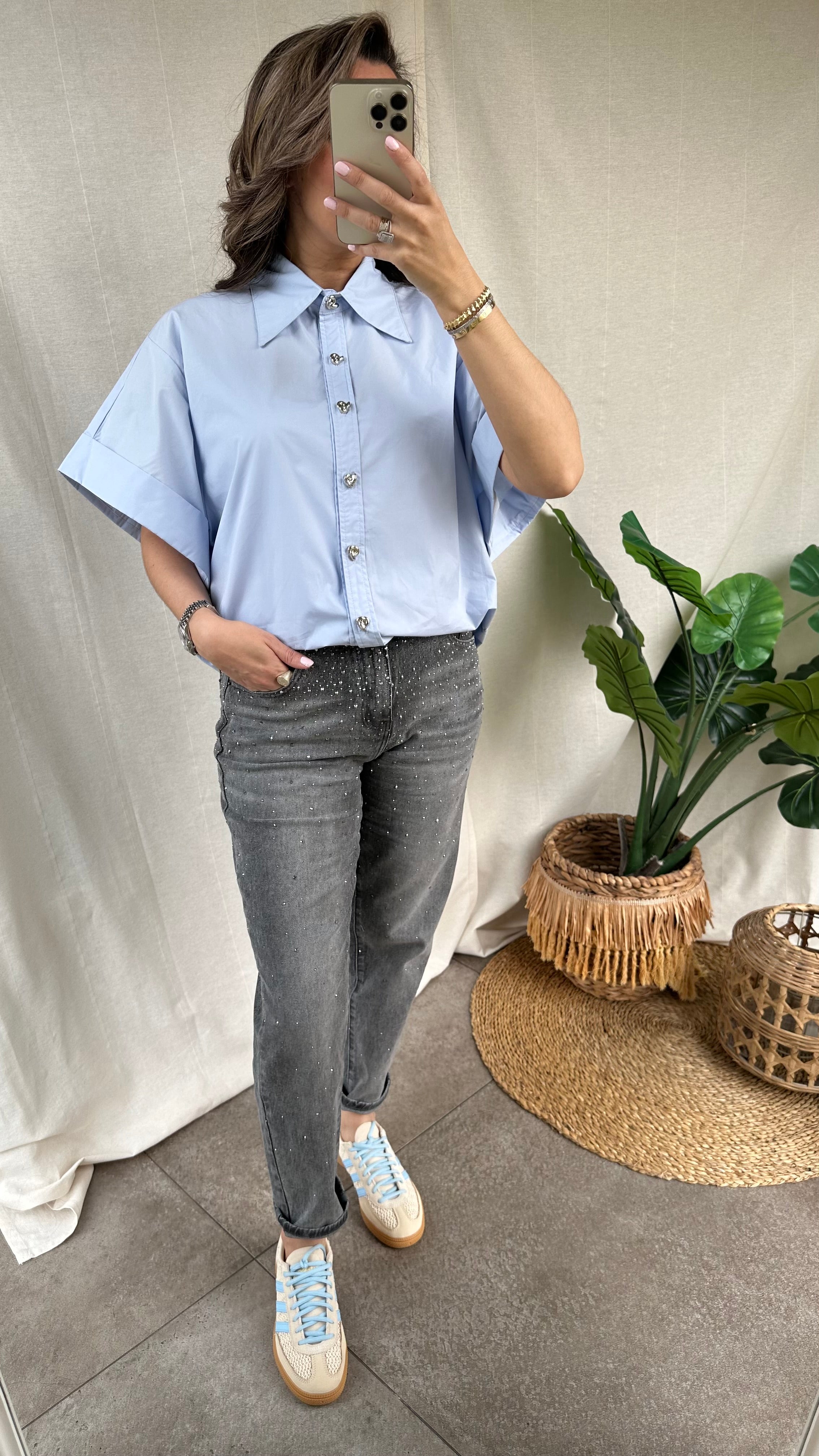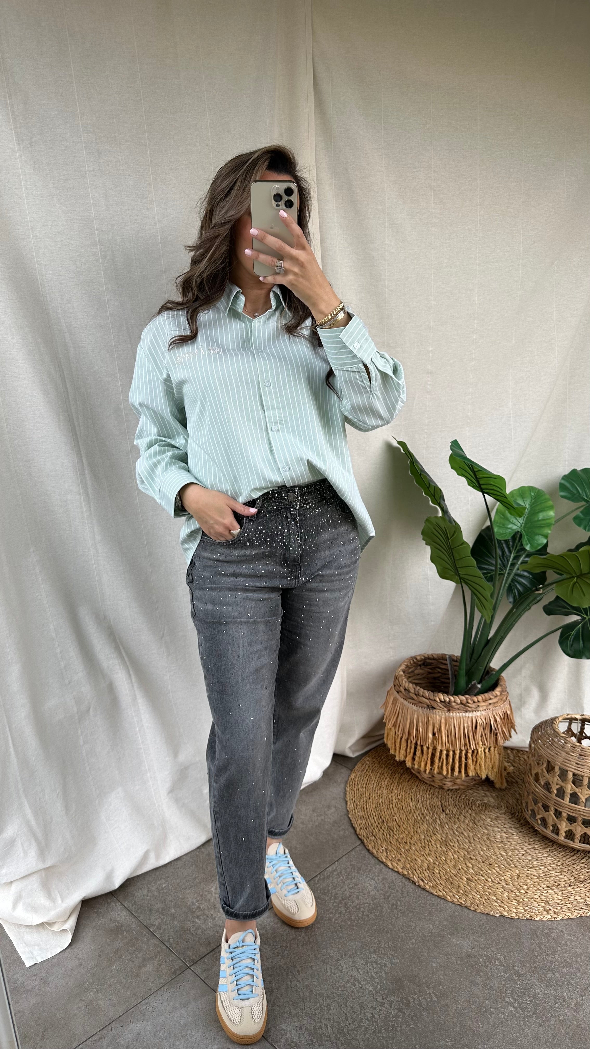 De grijze glitter jeans is een moderne en comfortabele jeans die perfect is voor een trendy, casual look. Wat deze jeans extra leuk maakt zijn de subtiele glitters waardoor de jeans een fashionable en speels accent krijgt. De jeans heeft een mom fit die relaxed valt en valt mooi op maat.