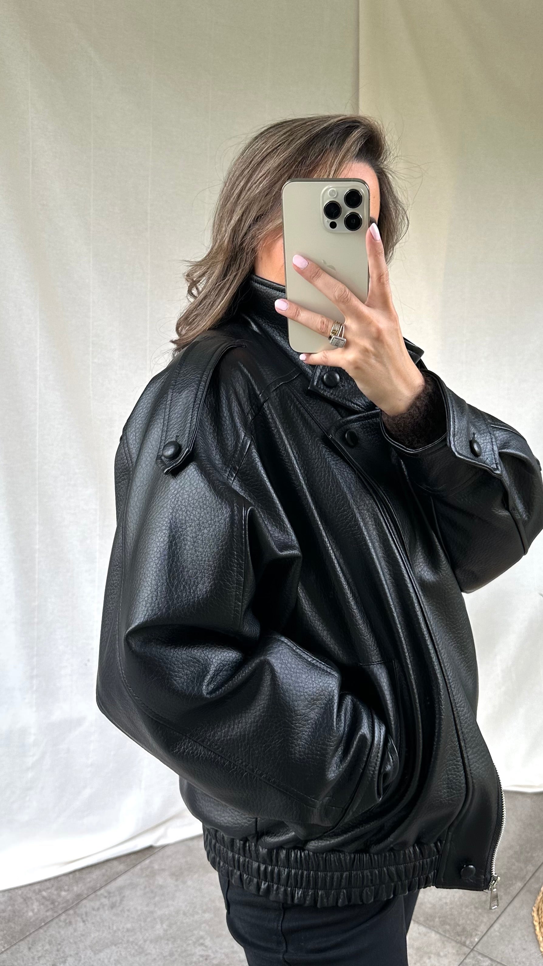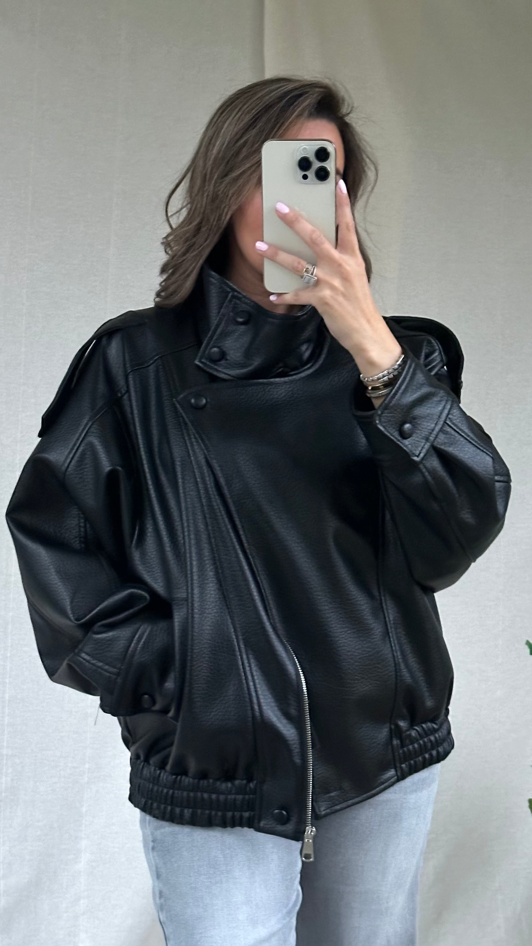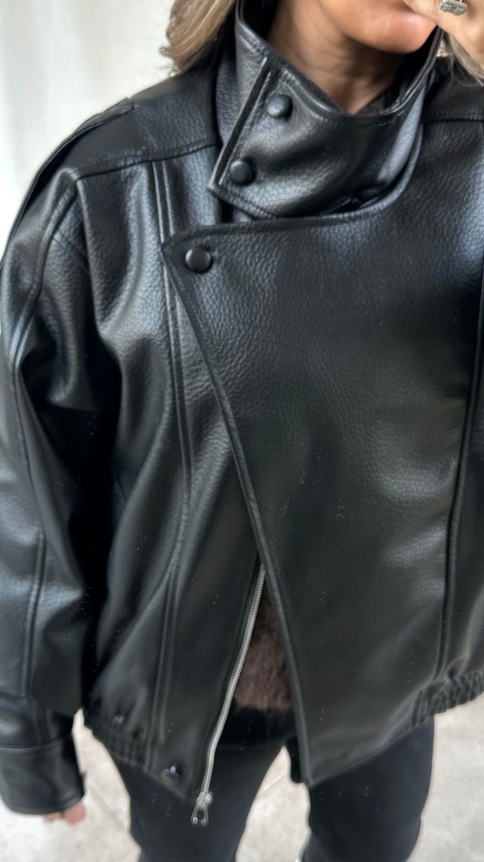 Trendy zwarte lederlook jacket dat momenteel viraal gaat en zorgt voor een stoere, fashionable look. De jacket is een onesize en kan gedragen worden van een S tot L.
