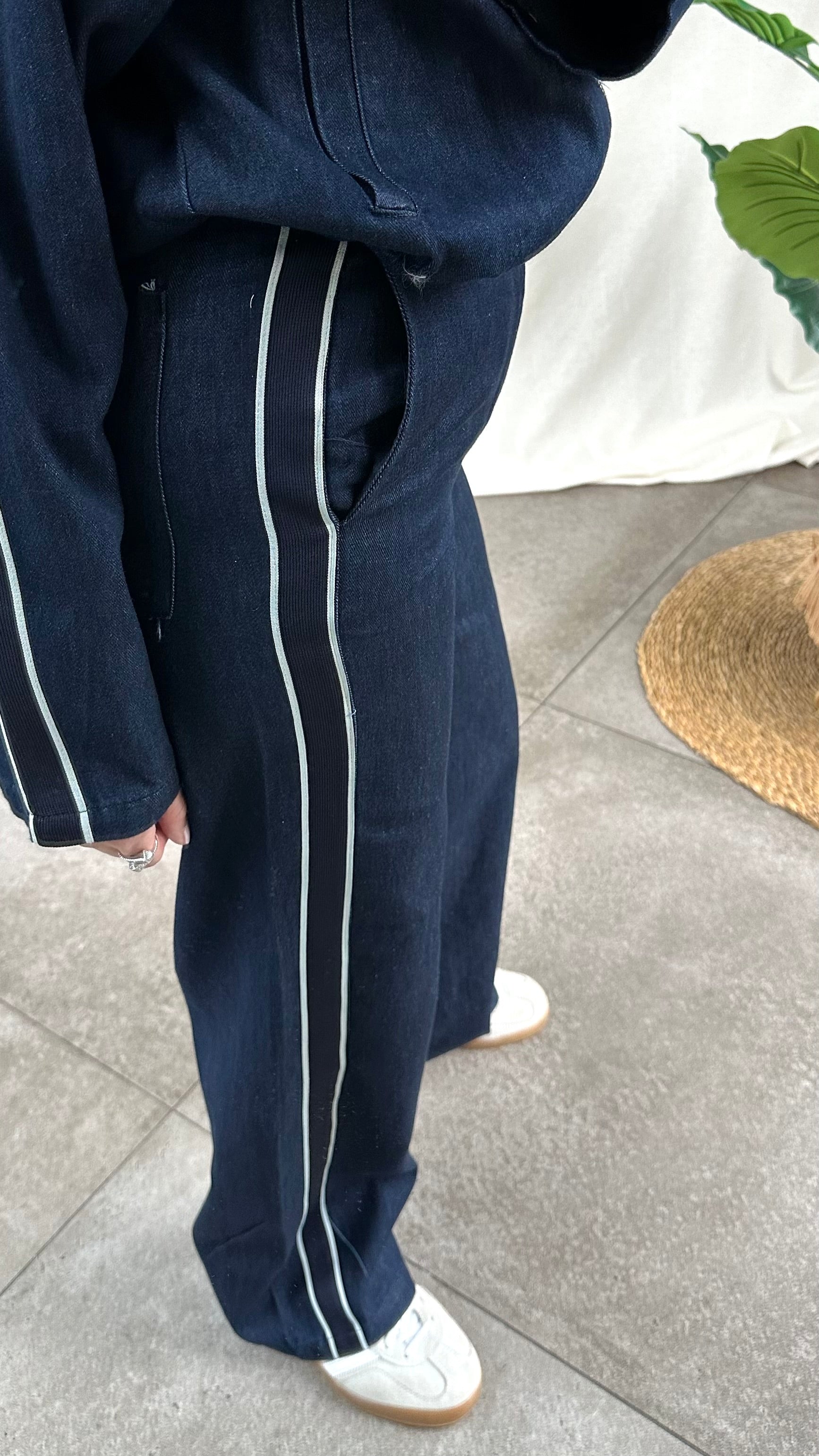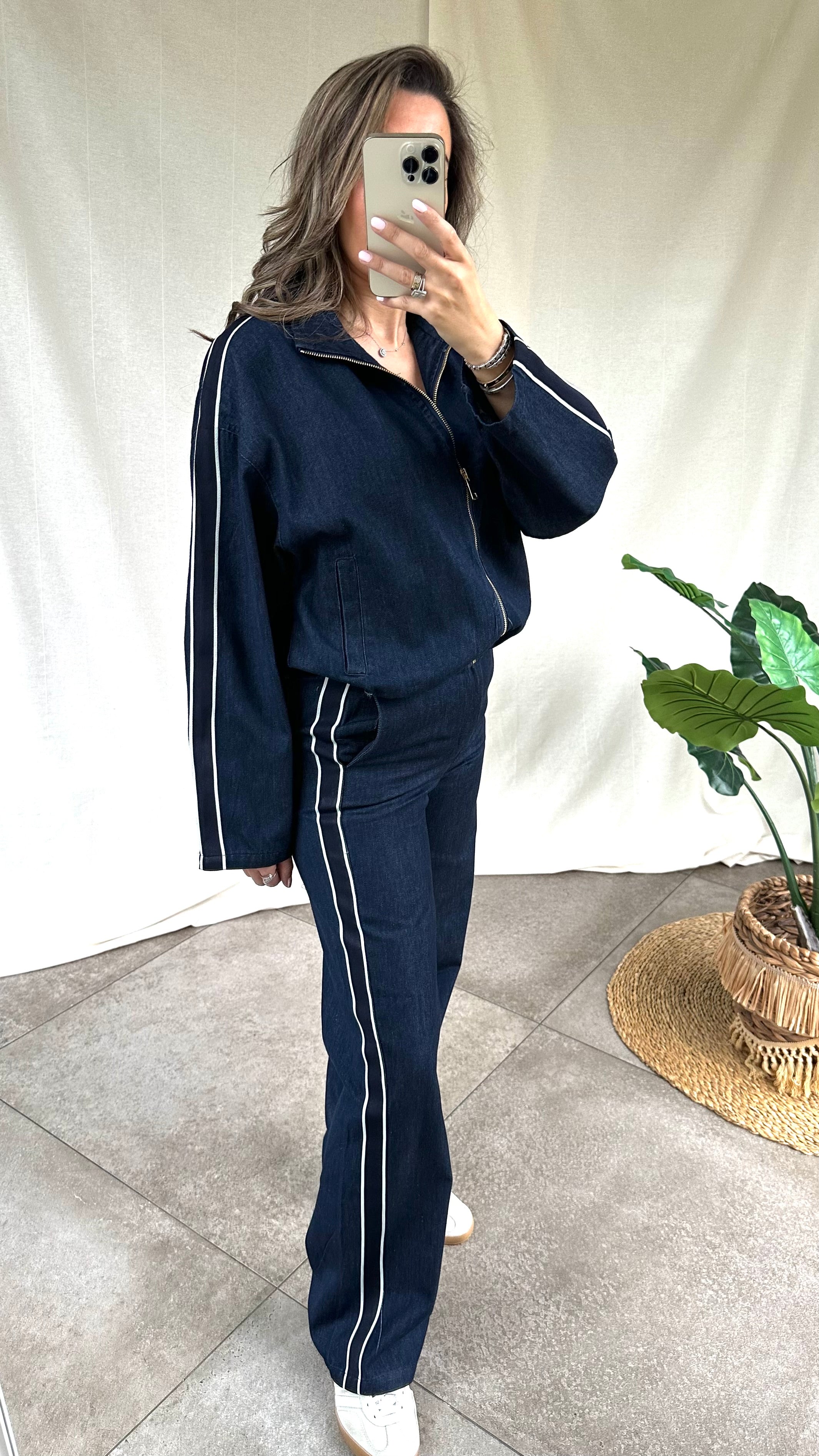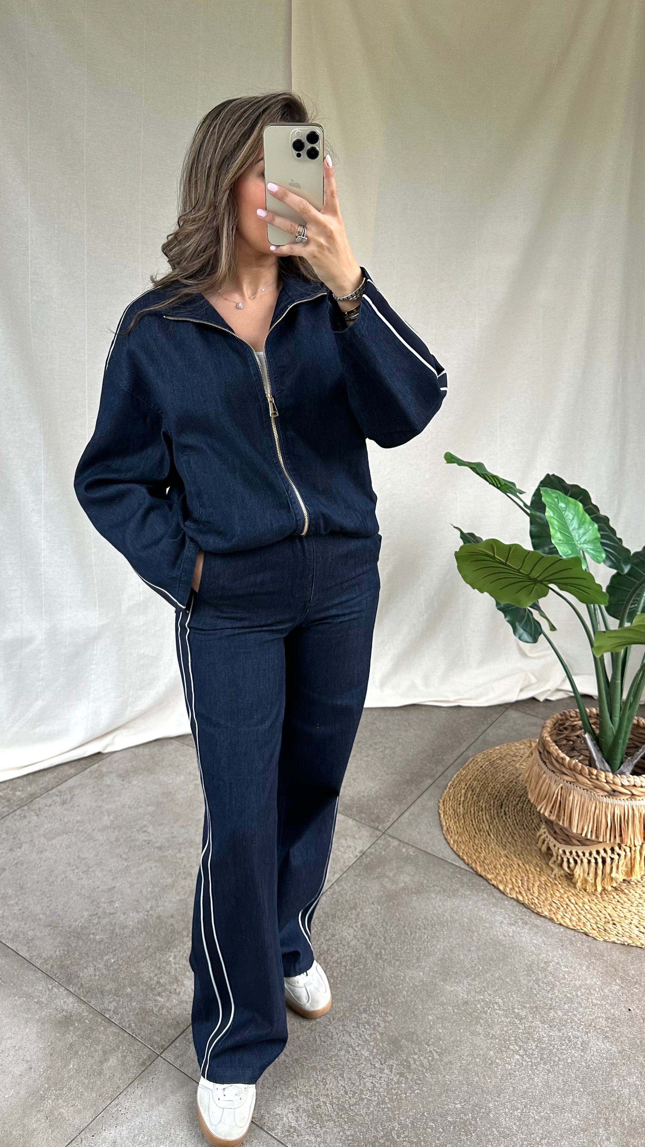 Stijlvol setje in het denim met een wijde broek en trendy bomber vestje. Het setje valt mooi op maat.