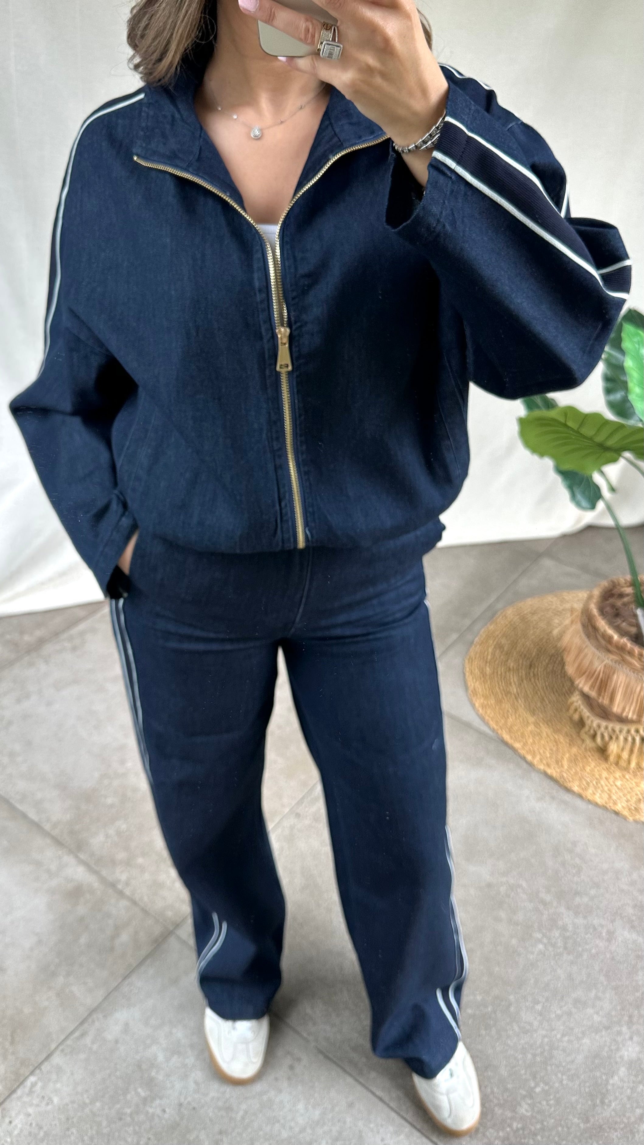 Stijlvol setje in het denim met een wijde broek en trendy bomber vestje. Het setje valt mooi op maat. Model...