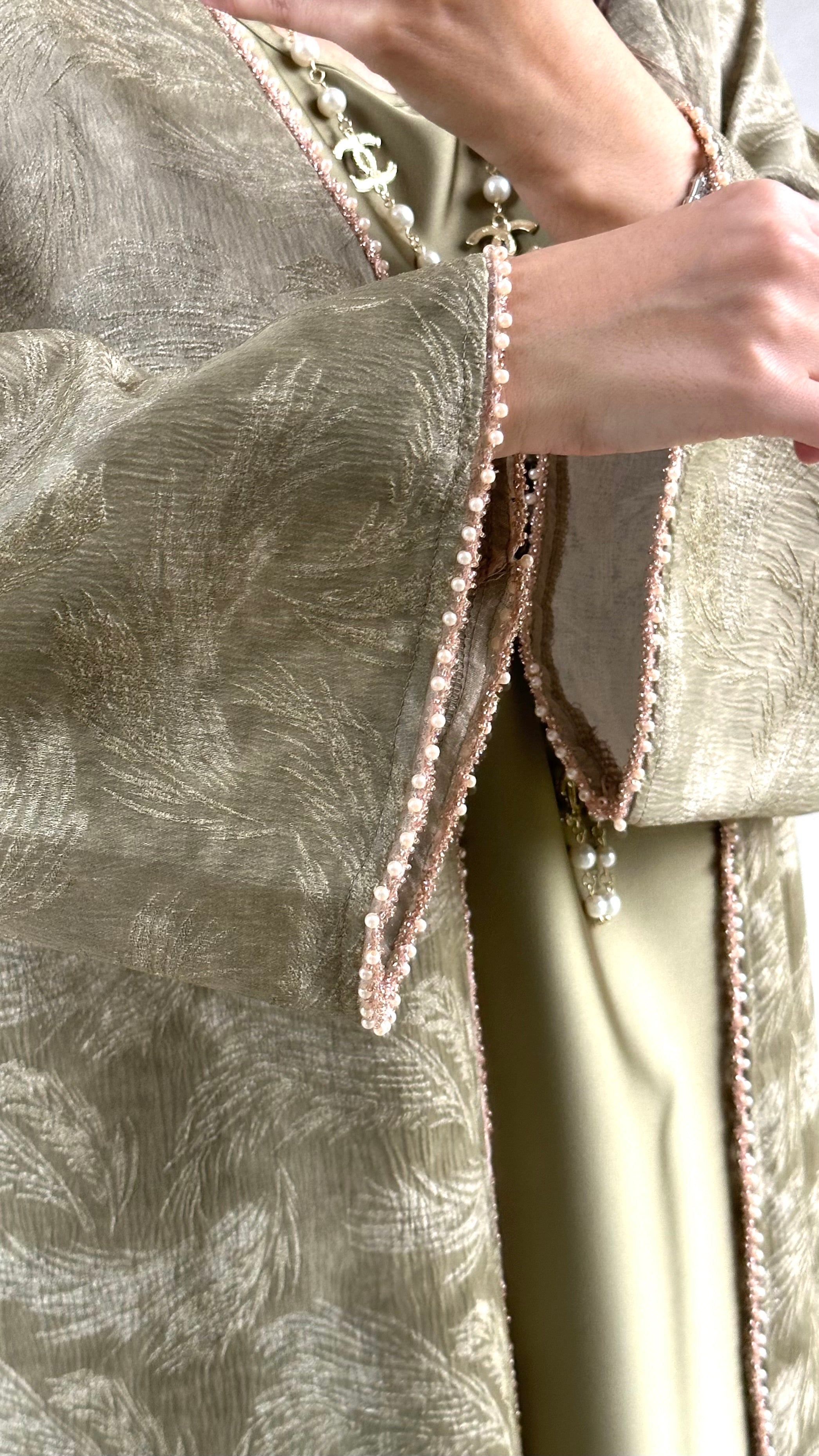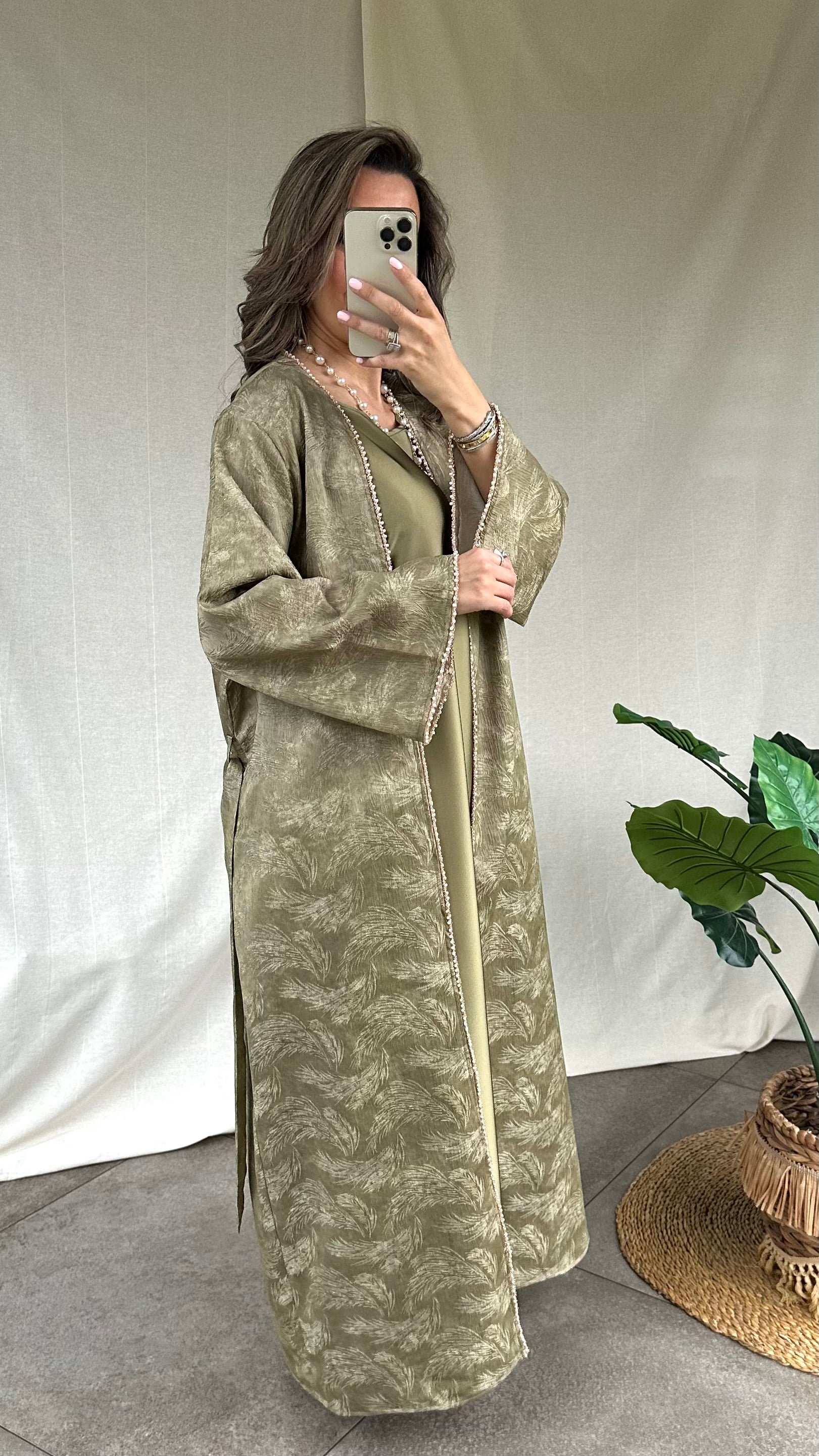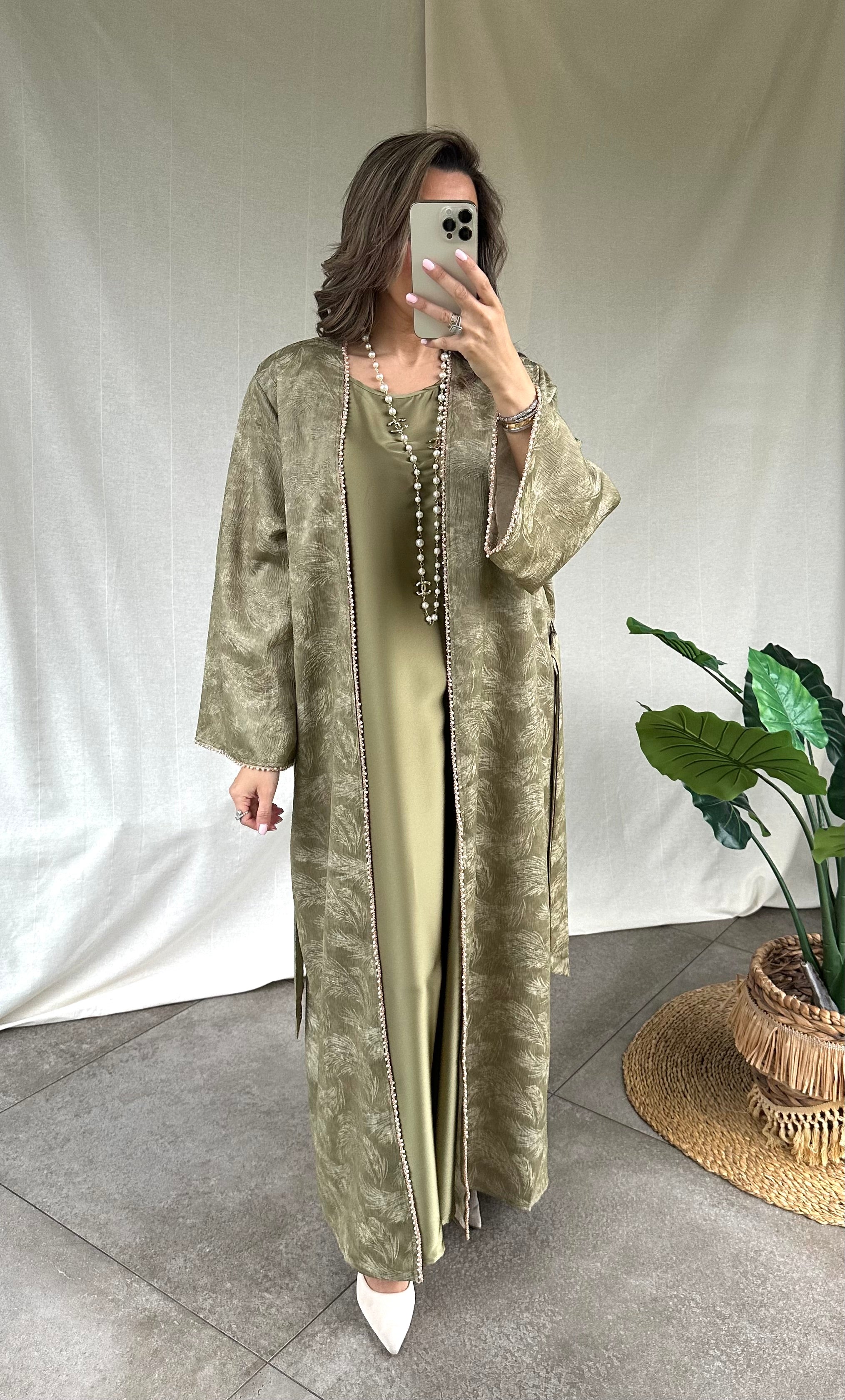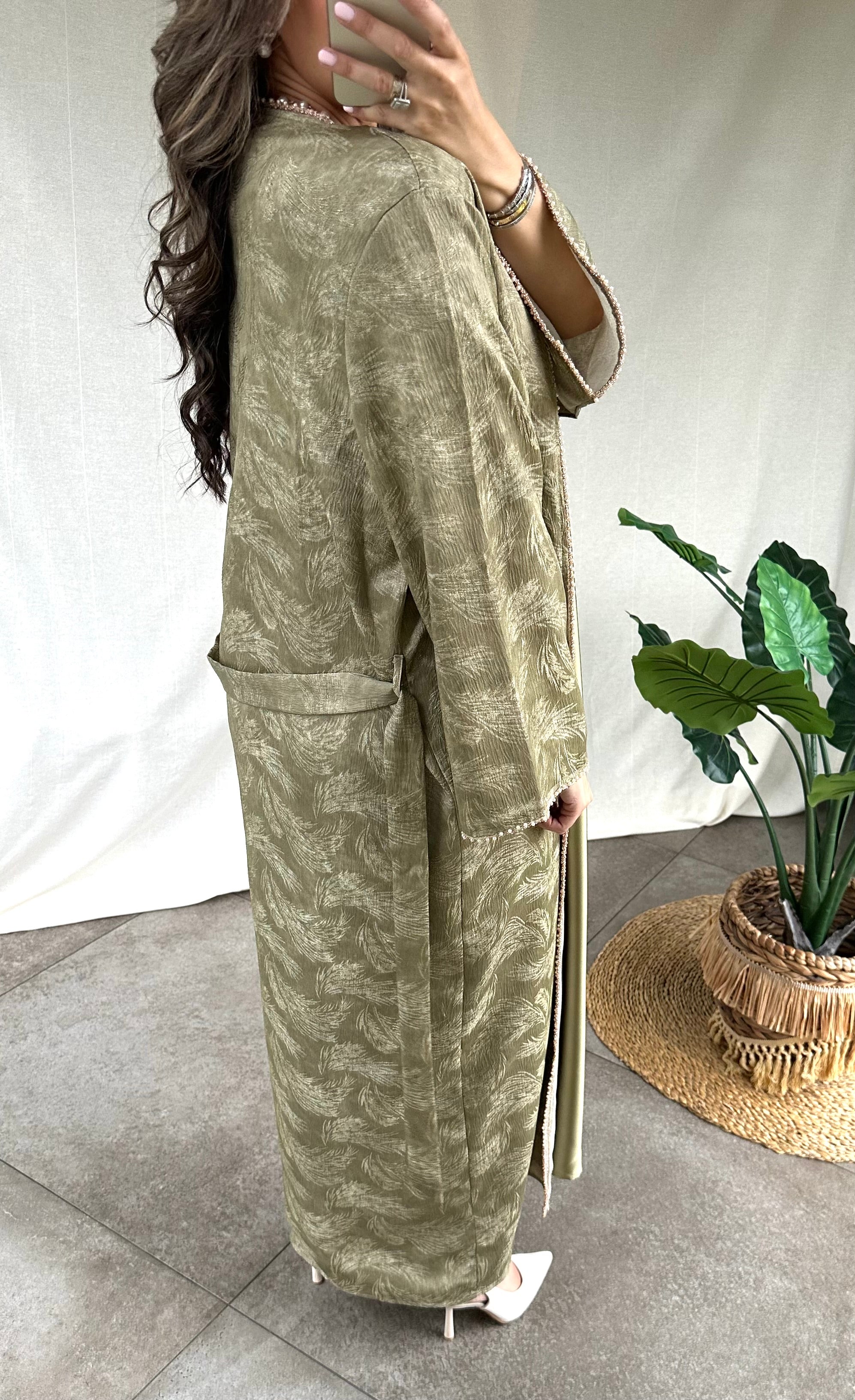 De Amina Abaya set in een mooie kaki kleur combineert verfijning met subtiele luxe. De set bestaat uit een mouwloze satijn onderjurk met daarover de bijpassende kimono. Deze set heeft een rechte snit waaronder ook de mouwen. Deze zijn afgewerkt met fijne pareldetails in het roségoud.