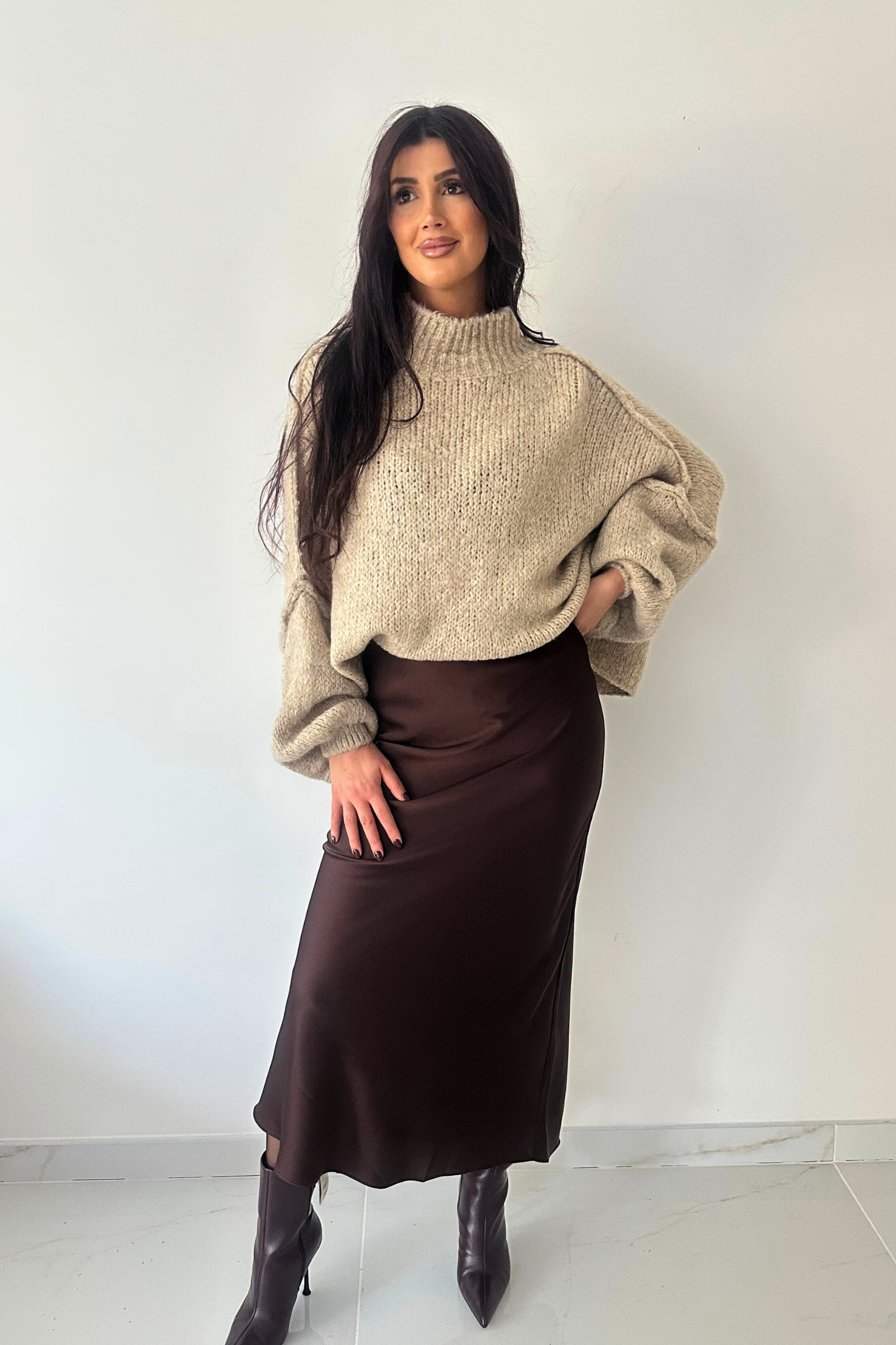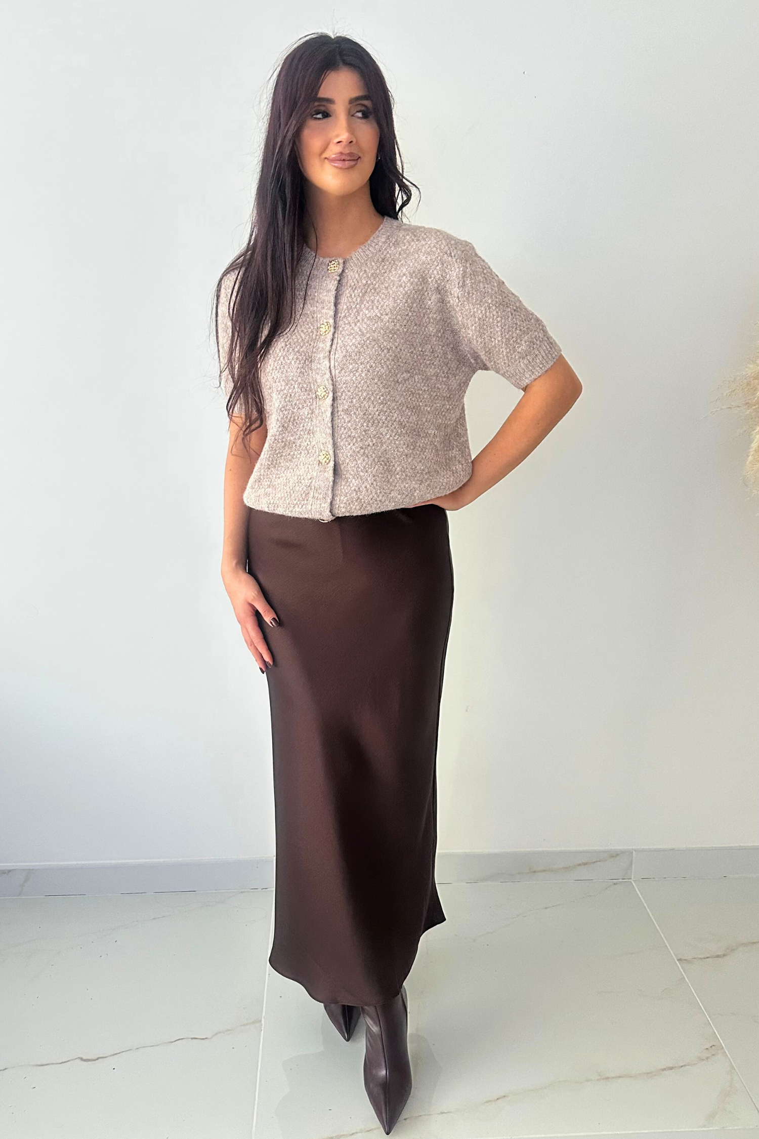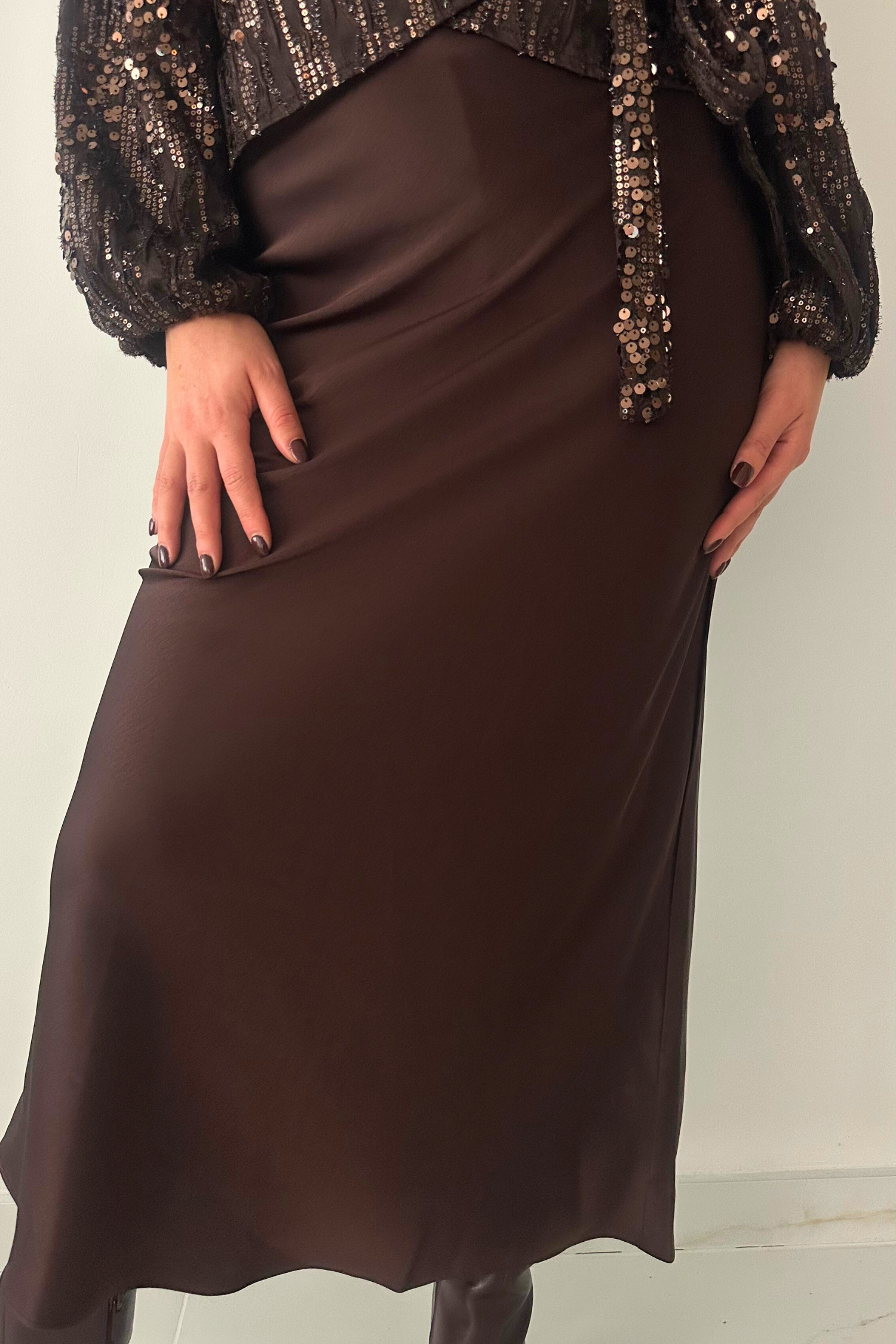 Deze lange bruine satijnen rok straalt pure elegantie en eenvoud uit. De stof heeft een subtiele glans en valt mooi soepel langs het lichaam, wat zorgt voor een vrouwelijke en verfijnde look.
