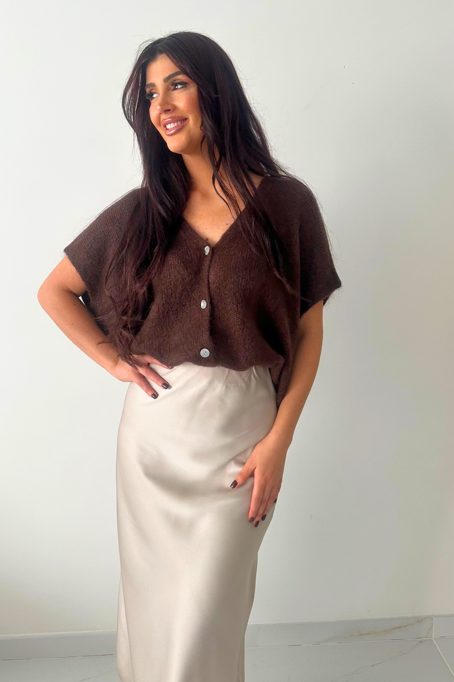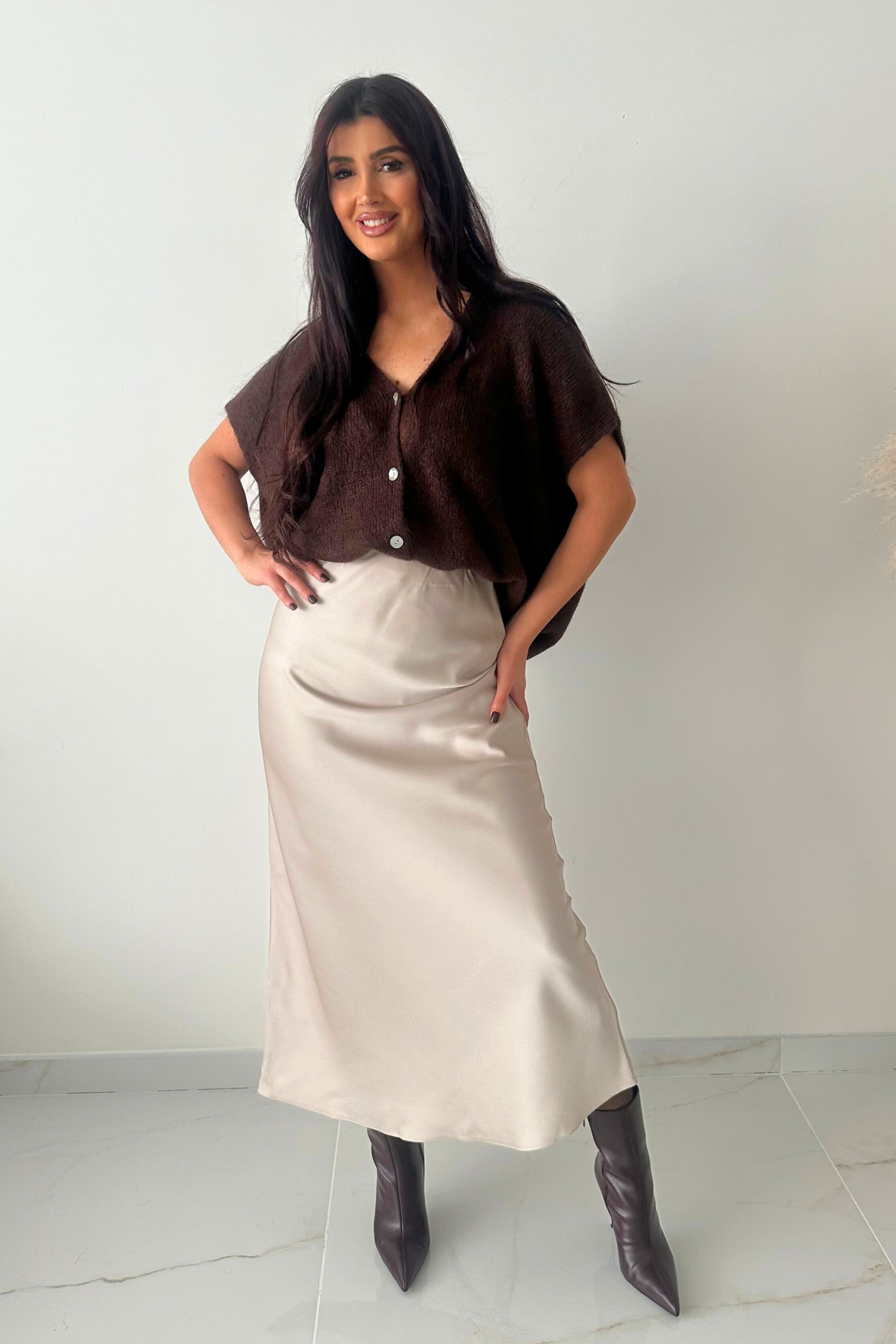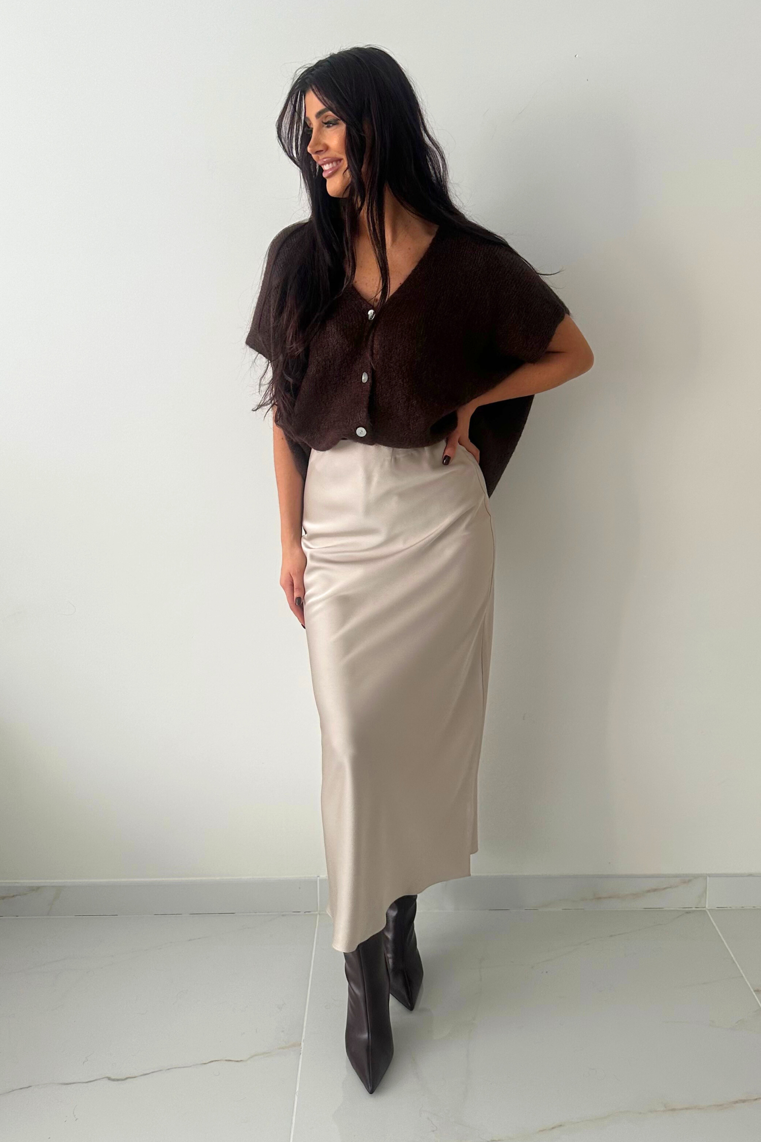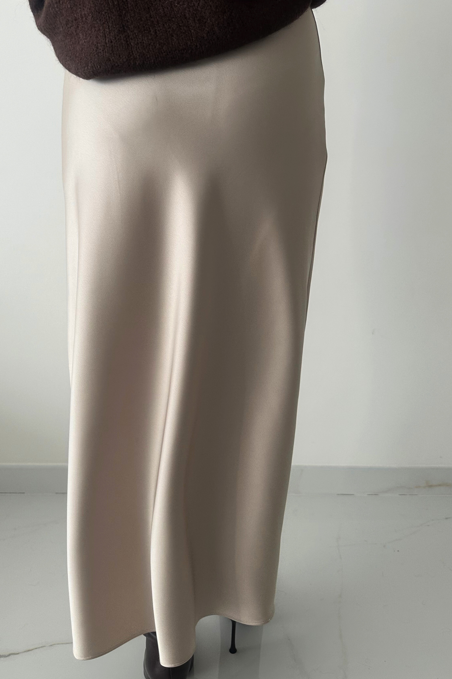 Deze lange ecru satijnen rok straalt pure elegantie en eenvoud uit. De stof heeft een subtiele glans en valt mooi soepel langs het lichaam, wat zorgt voor een vrouwelijke en verfijnde look?