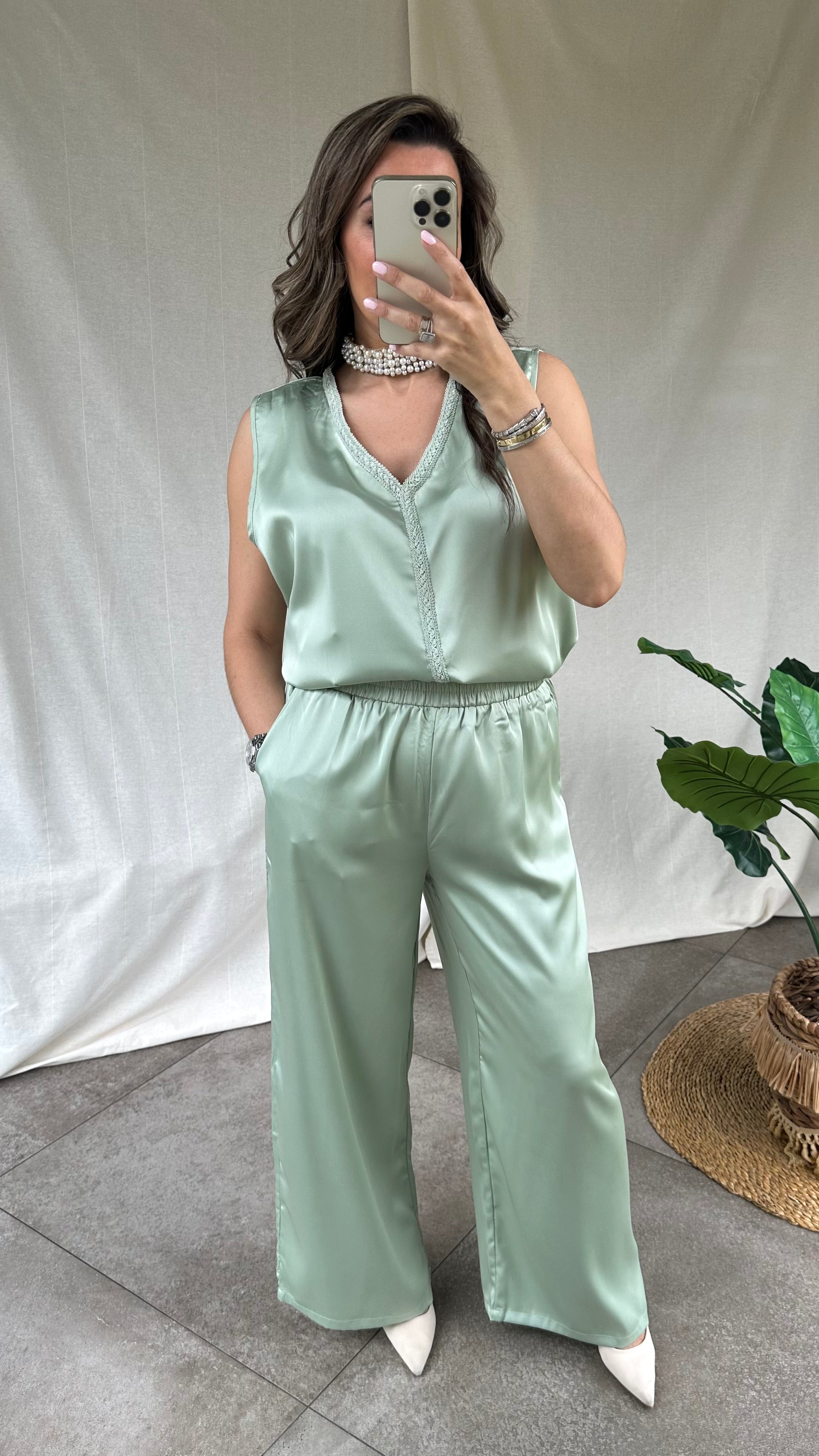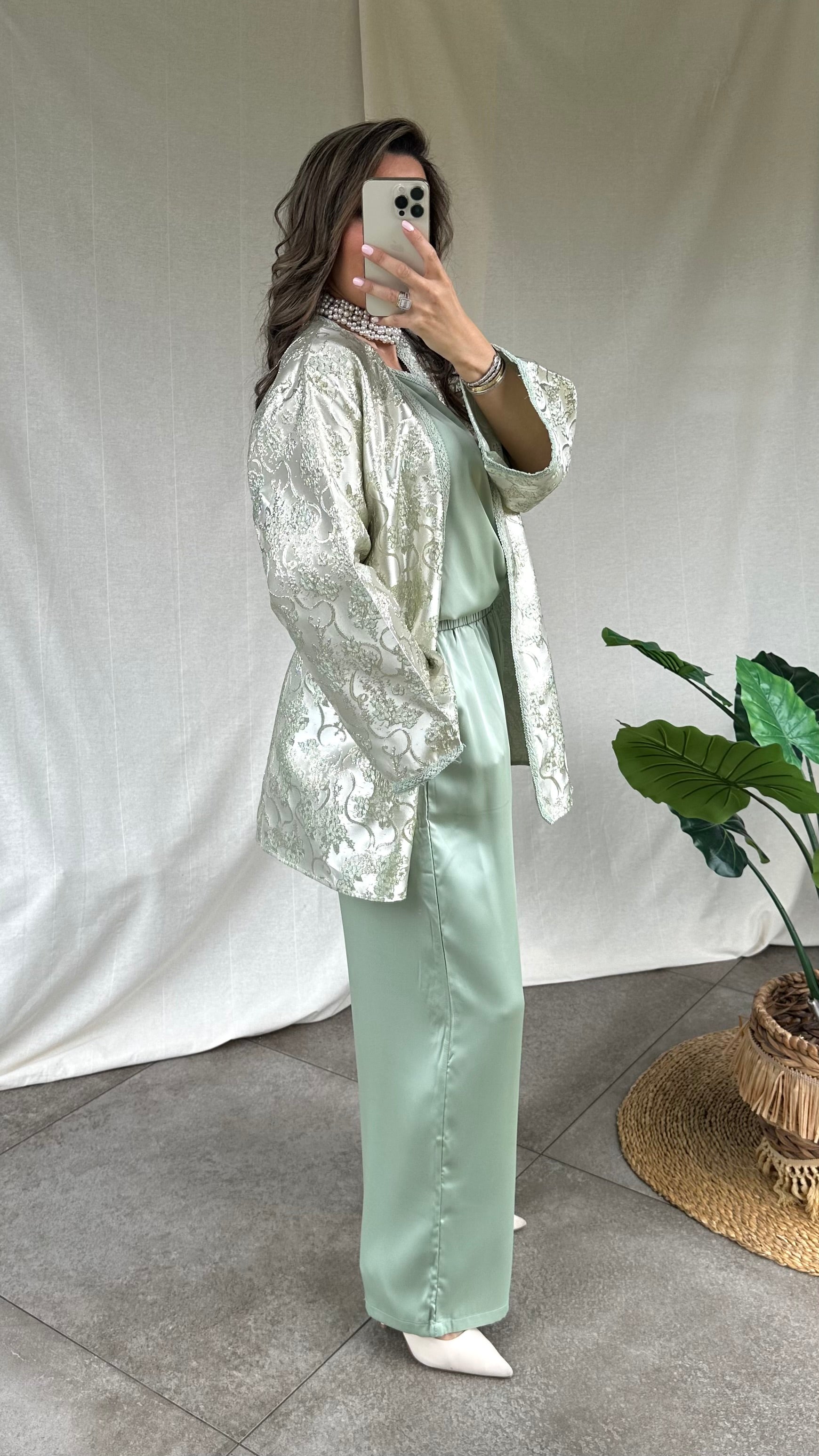 De Zahra set combineert comfort met verfijning en luxe detail. De set bestaat uit een breedvallende satijnen broek met een elastische tailleband en twee zakken. Het bovenstuk, een lange mouwloze tuniek met daarover het vestje in een brokaatstof die het geheel afmaakt. Het vestje heeft lange mouwen en een taillelint, zodat je de fit naar wens kunt sluiten.