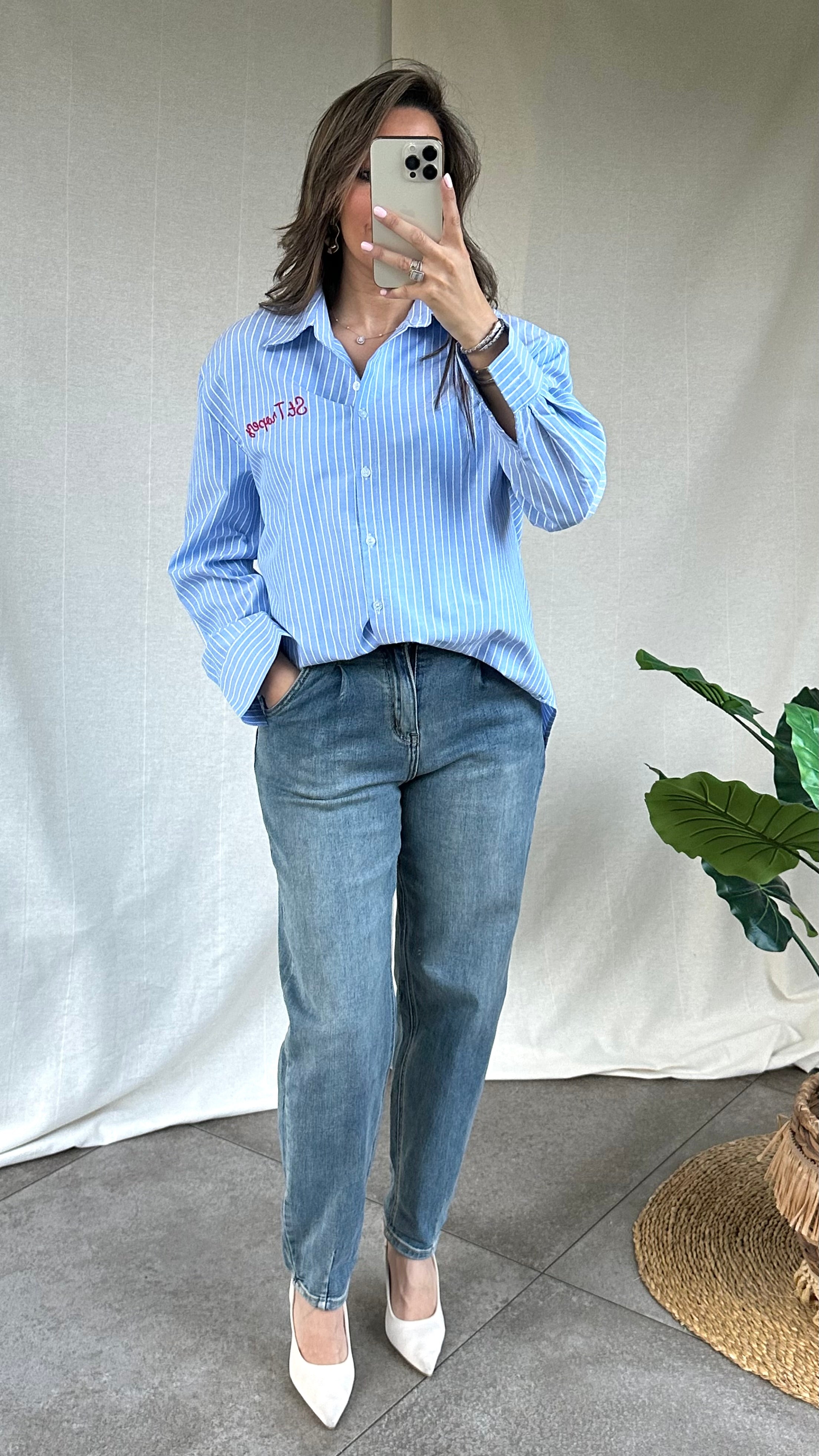 Trendy oversized hemdje in het lichtblauw met witte strepen, afgewerkt met rode Saint-Tropez borduring op de borst en groot op...