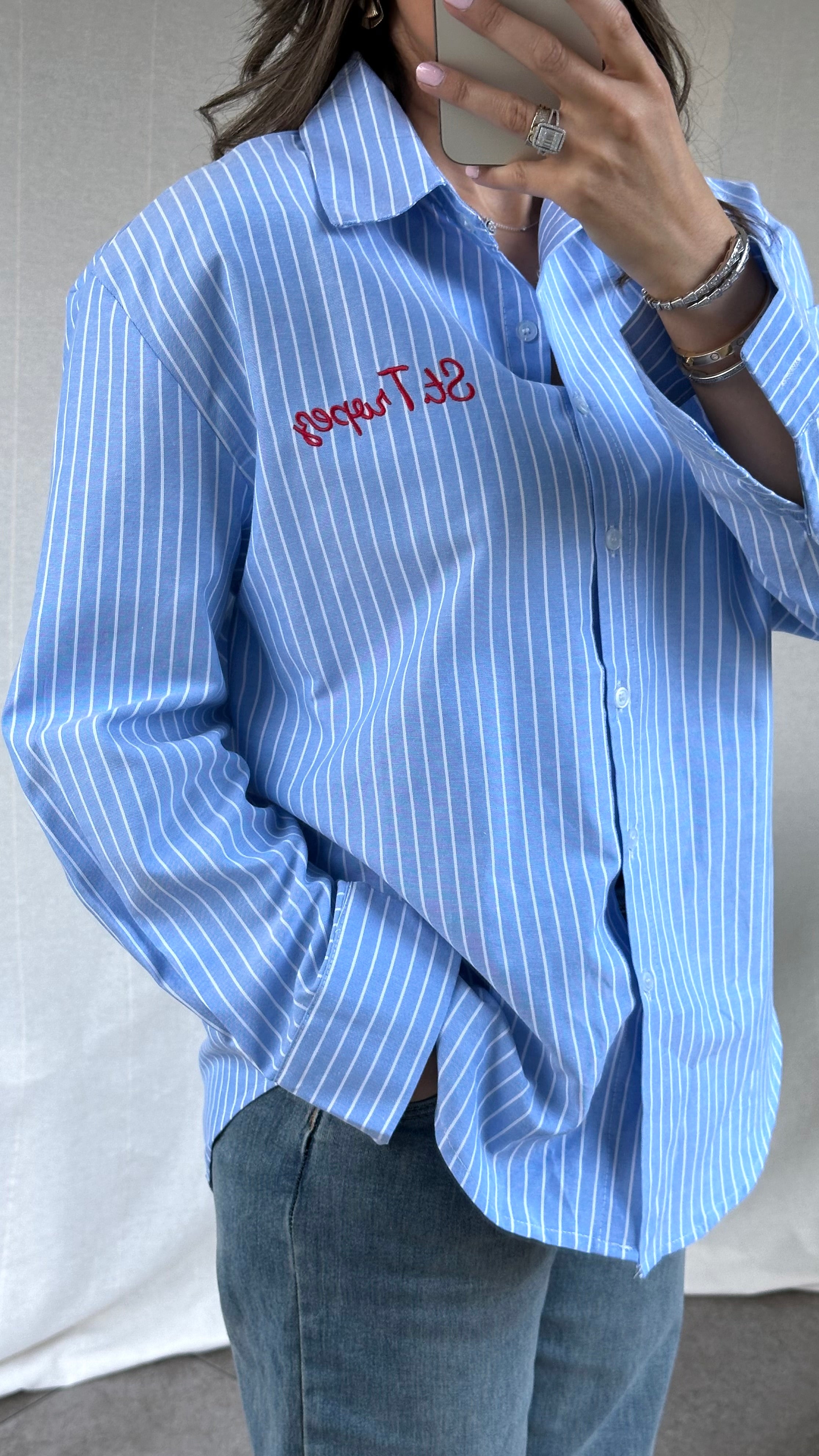 Trendy oversized hemdje in het lichtblauw met witte strepen, afgewerkt met rode Saint-Tropez borduring op de borst en groot op de rug.