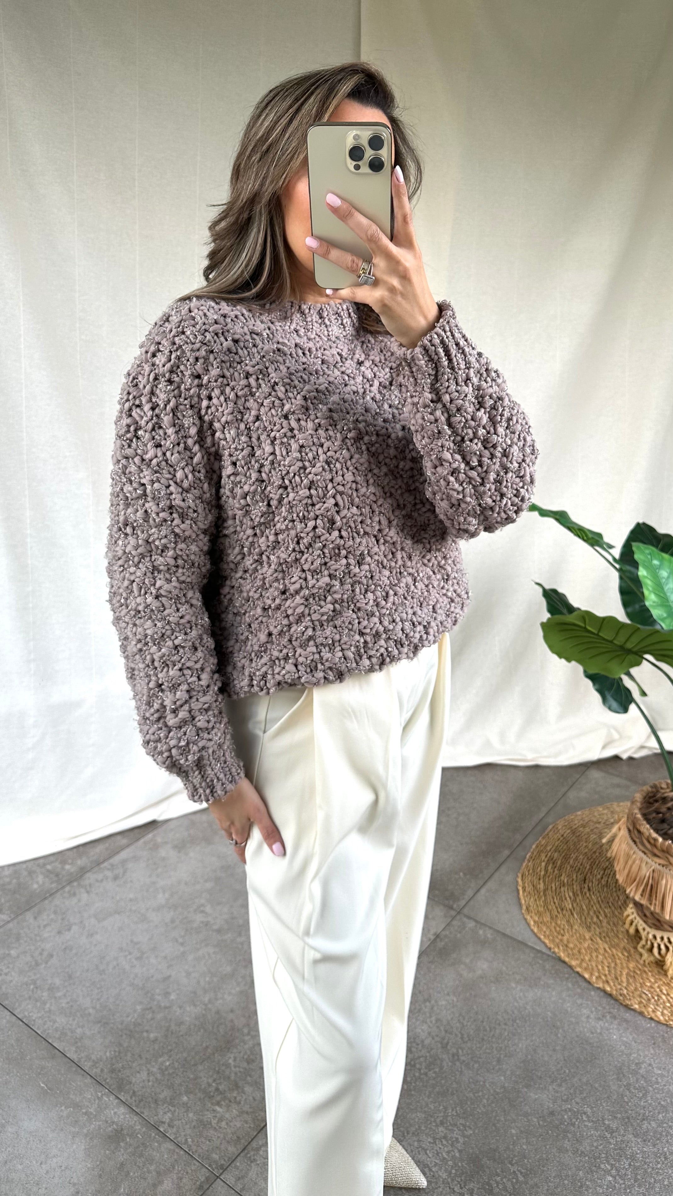 Deze moderne kabeltrui in het taupe is een tijdloos en stijlvol item. De trui heeft een elegant kabelpatroon die volledig is uitgevoerd in licht taupe, wat zorgt voor een rustige en luxe uitstraling. De pull is een onesize en kan gedragen worden van een S tot een L.